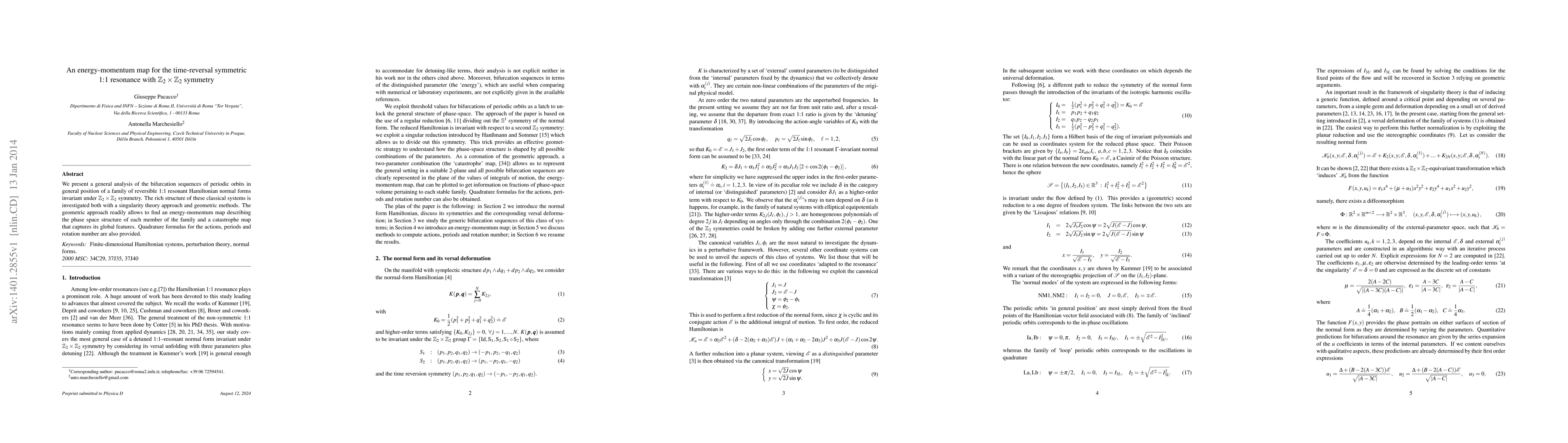 We present a general analysis of the bifurcation sequences of periodic orbits in general position of a family of reversible 1:1 resonant Hamiltonian normal forms invariant under $\Z_2\times\Z_2$ symmetry. The rich structure of these classical systems is investigated both with a singularity theory approach and geometric methods. The geometric approach readily allows to find an energy-momentum map describing the phase space structure of each member of the family and a catastrophe map that captures its global features. Quadrature formulas for the actions, periods and rotation number are also provided.