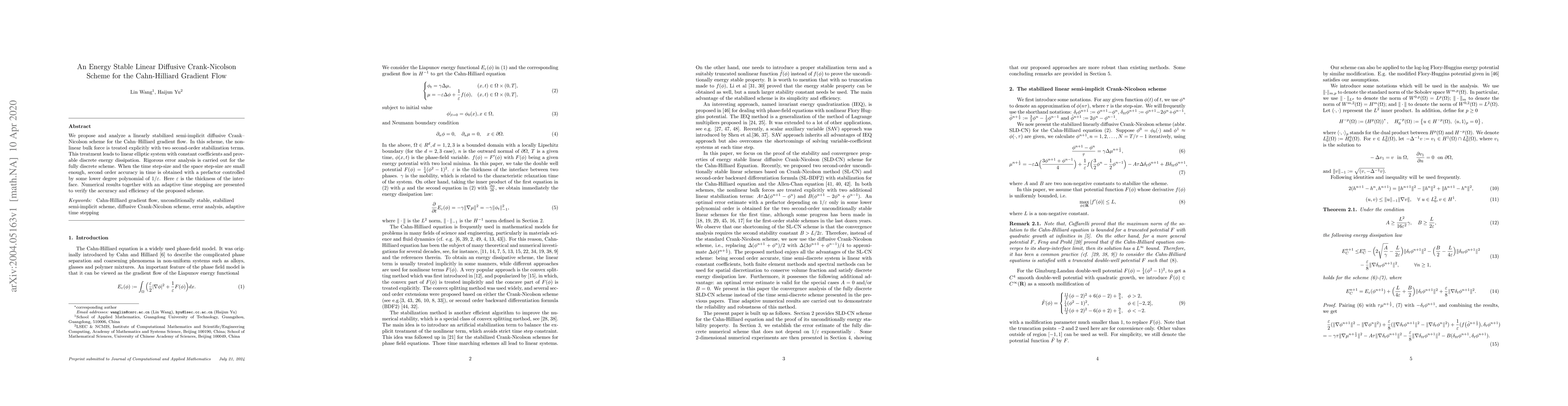 This paper proposes a linearly stabilized Crank-Nicolson scheme for the Cahn-Hilliard gradient flow, ensuring energy stability and provable discrete energy dissipation. The method achieves second-order accuracy in time under small time and space step sizes, and numerical results validate its accuracy and efficiency.