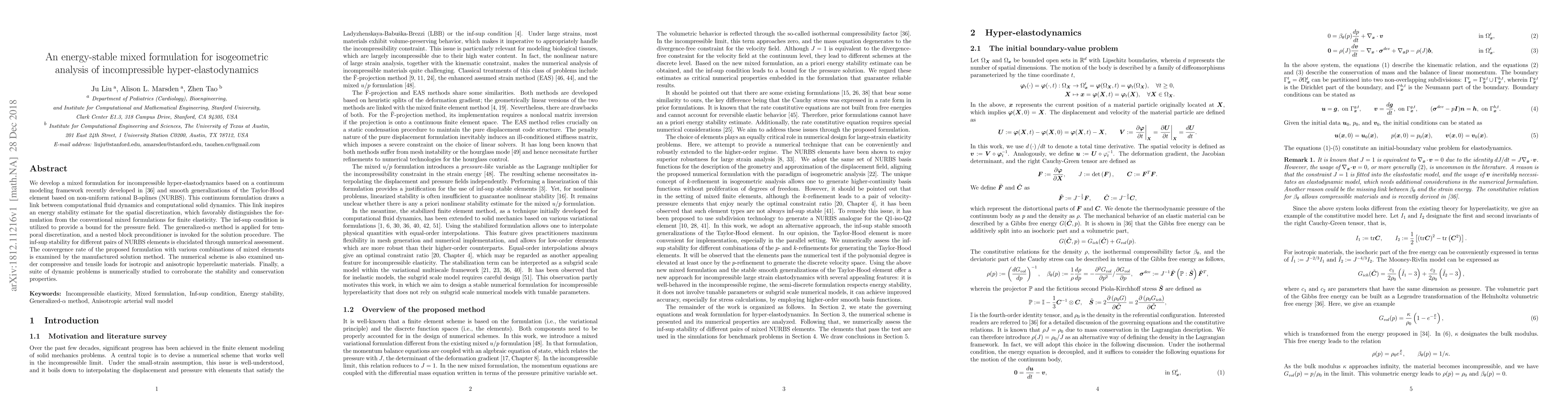 This paper proposes an energy-stable mixed formulation for isogeometric analysis of incompressible hyper-elastodynamics, utilizing NURBS-based Taylor-Hood elements and the generalized-$\alpha$ method for temporal discretization. Numerical assessments confirm inf-sup stability and convergence, and the method is validated through various dynamic simulations.