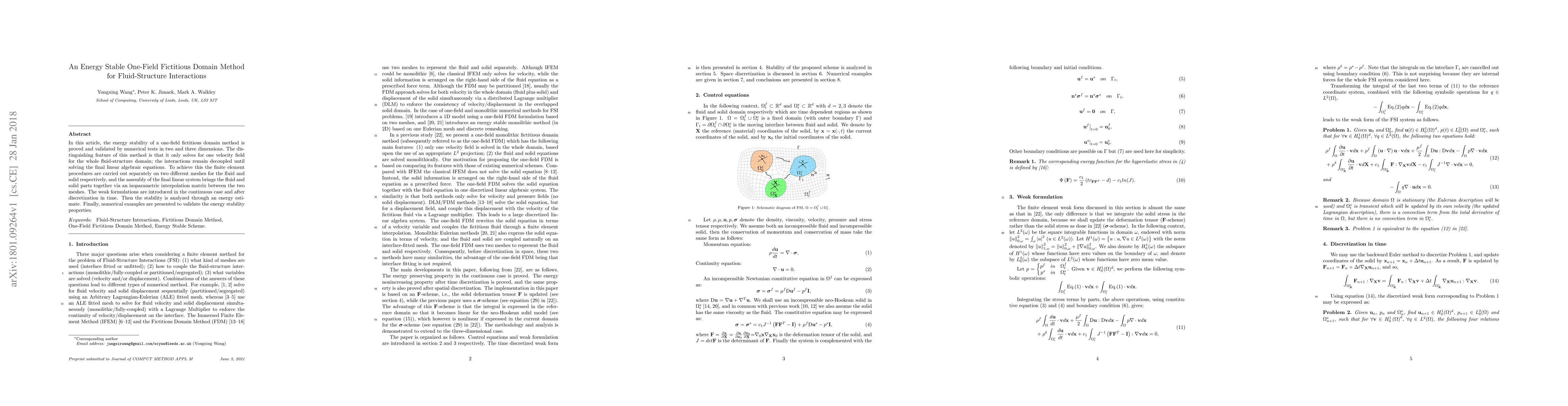 This paper presents an energy stable one-field fictitious domain method for fluid-structure interactions, proving its stability and validating it through numerical tests. The method solves a single velocity field across the fluid-structure domain, decoupling interactions until final linear algebraic equations are solved.