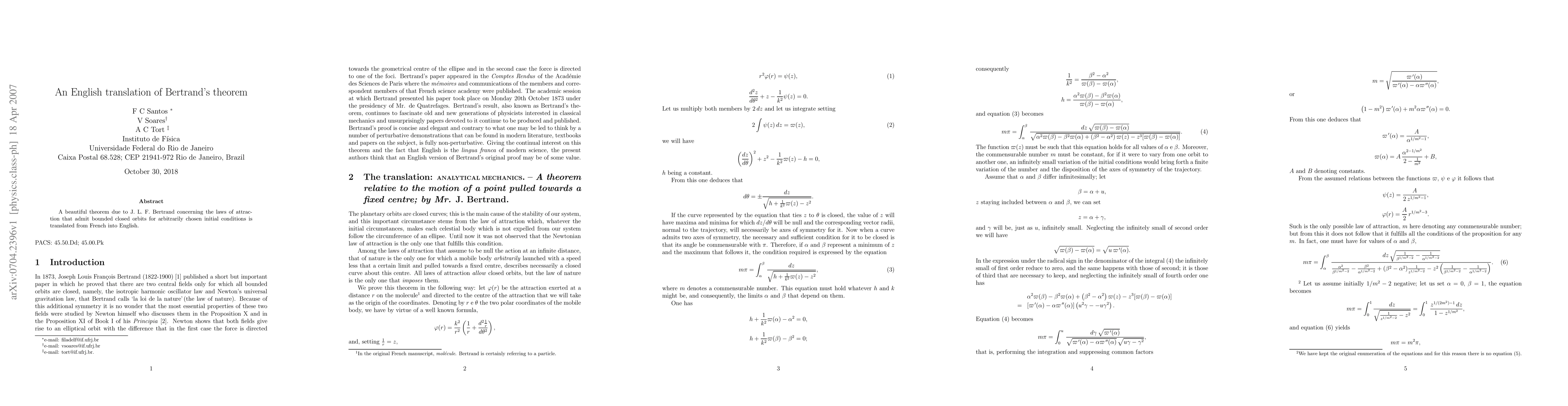 A beautiful theorem due to J. L. F. Bertrand concerning the laws of attraction that admit bounded closed orbits for arbitrarily chosen initial conditions is translated from French into English.