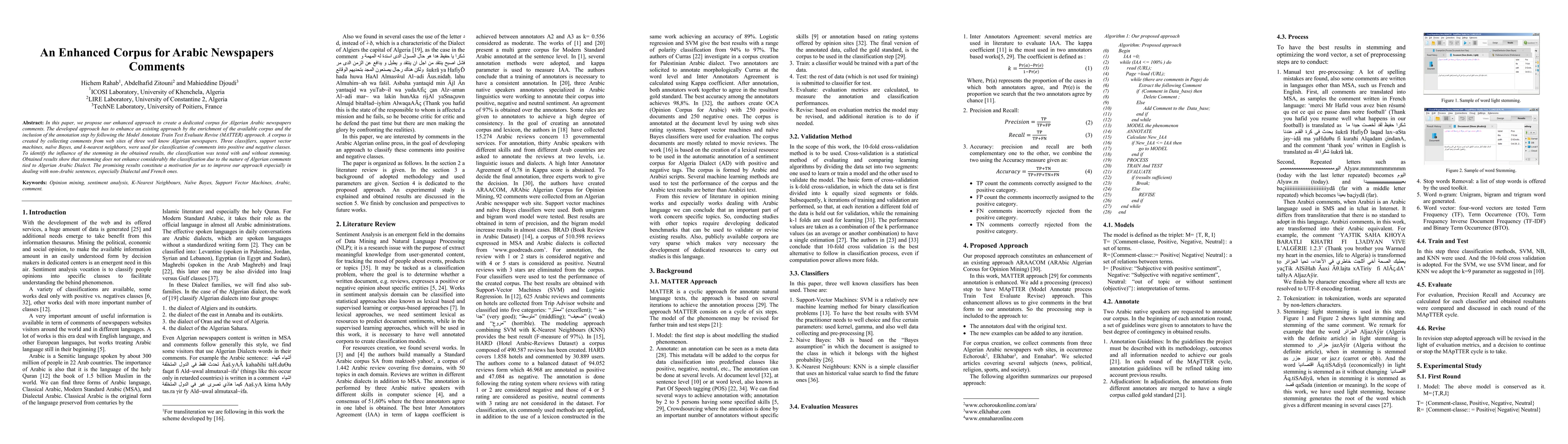 In this paper, we propose our enhanced approach to create a dedicated corpus for Algerian Arabic newspapers comments. The developed approach has to enhance an existing approach by the enrichment of the available corpus and the inclusion of the annotation step by following the Model Annotate Train Test Evaluate Revise (MATTER) approach. A corpus is created by collecting comments from web sites of three well know Algerian newspapers. Three classifiers, support vector machines, na{\"i}ve Bayes, and k-nearest neighbors, were used for classification of comments into positive and negative classes. To identify the influence of the stemming in the obtained results, the classification was tested with and without stemming. Obtained results show that stemming does not enhance considerably the classification due to the nature of Algerian comments tied to Algerian Arabic Dialect. The promising results constitute a motivation for us to improve our approach especially in dealing with non Arabic sentences, especially Dialectal and French ones.