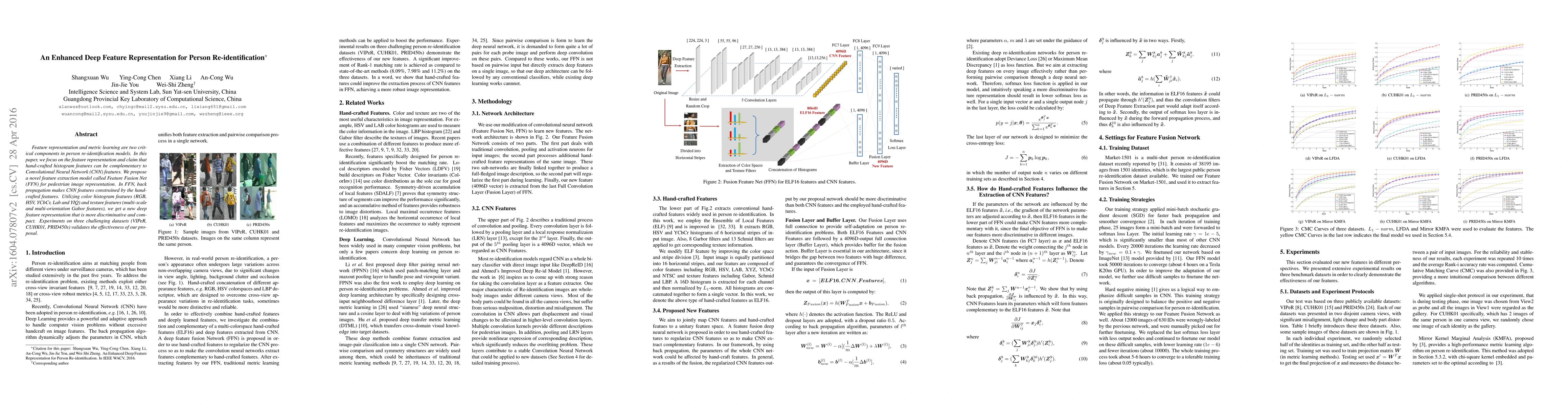 This paper introduces Feature Fusion Net (FFN) to enhance person re-identification by combining Convolutional Neural Network features with complementary handcrafted histogram and texture features. Experiments on VIPeR, CUHK01, and PRID450s datasets show improved discriminative and compact feature representation.