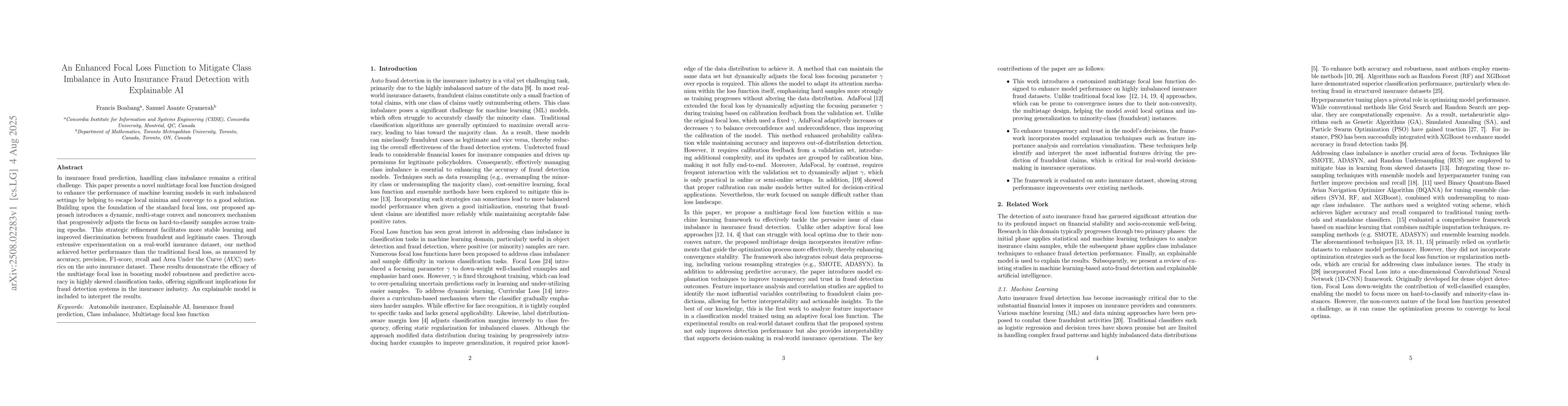 In insurance fraud prediction, handling class imbalance remains a critical challenge. This paper presents a novel multistage focal loss function designed to enhance the performance of machine learning models in such imbalanced settings by helping to escape local minima and converge to a good solution. Building upon the foundation of the standard focal loss, our proposed approach introduces a dynamic, multi-stage convex and nonconvex mechanism that progressively adjusts the focus on hard-to-classify samples across training epochs. This strategic refinement facilitates more stable learning and improved discrimination between fraudulent and legitimate cases. Through extensive experimentation on a real-world insurance dataset, our method achieved better performance than the traditional focal loss, as measured by accuracy, precision, F1-score, recall and Area Under the Curve (AUC) metrics on the auto insurance dataset. These results demonstrate the efficacy of the multistage focal loss in boosting model robustness and predictive accuracy in highly skewed classification tasks, offering significant implications for fraud detection systems in the insurance industry. An explainable model is included to interpret the results.