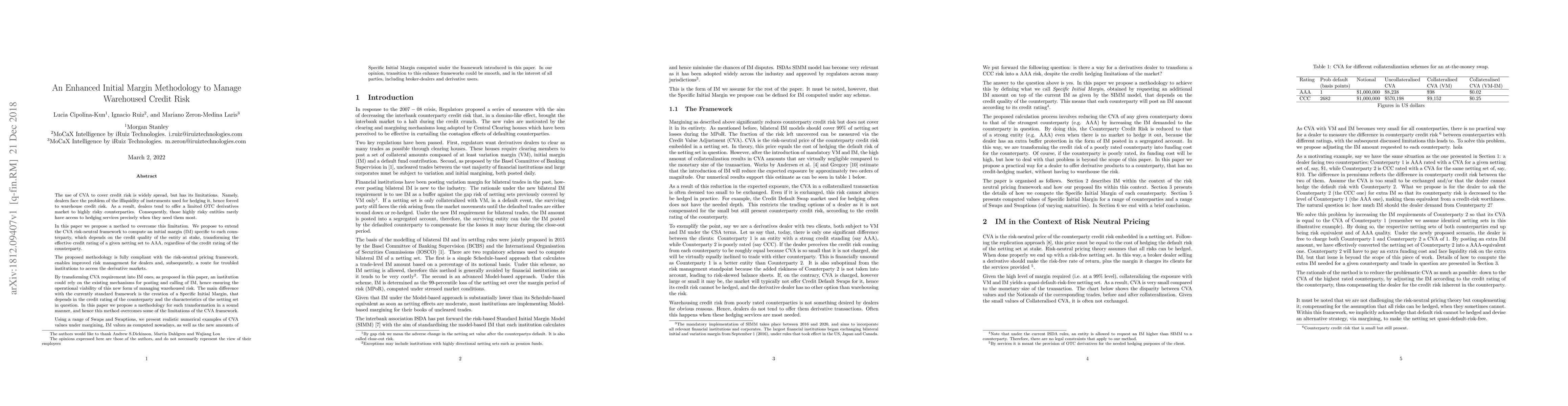 The use of CVA to cover credit risk is widely spread, but has its limitations. Namely, dealers face the problem of the illiquidity of instruments used for hedging it, hence forced to warehouse credit risk. As a result, dealers tend to offer a limited OTC derivatives market to highly risky counterparties. Consequently, those highly risky entities rarely have access to hedging services precisely when they need them most. In this paper we propose a method to overcome this limitation. We propose to extend the CVA risk-neutral framework to compute an initial margin (IM) specific to each counterparty, which depends on the credit quality of the entity at stake, transforming the effective credit rating of a given netting set to AAA, regardless of the credit rating of the counterparty. By transforming CVA requirement into IM ones, as proposed in this paper, an institution could rely on the existing mechanisms for posting and calling of IM, hence ensuring the operational viability of this new form of managing warehoused risk. The main difference with the currently standard framework is the creation of a Specific Initial Margin, that depends in the credit rating of the counterparty and the characteristics of the netting set in question. In this paper we propose a methodology for such transformation in a sound manner, and hence this method overcomes some of the limitations of the CVA framework.