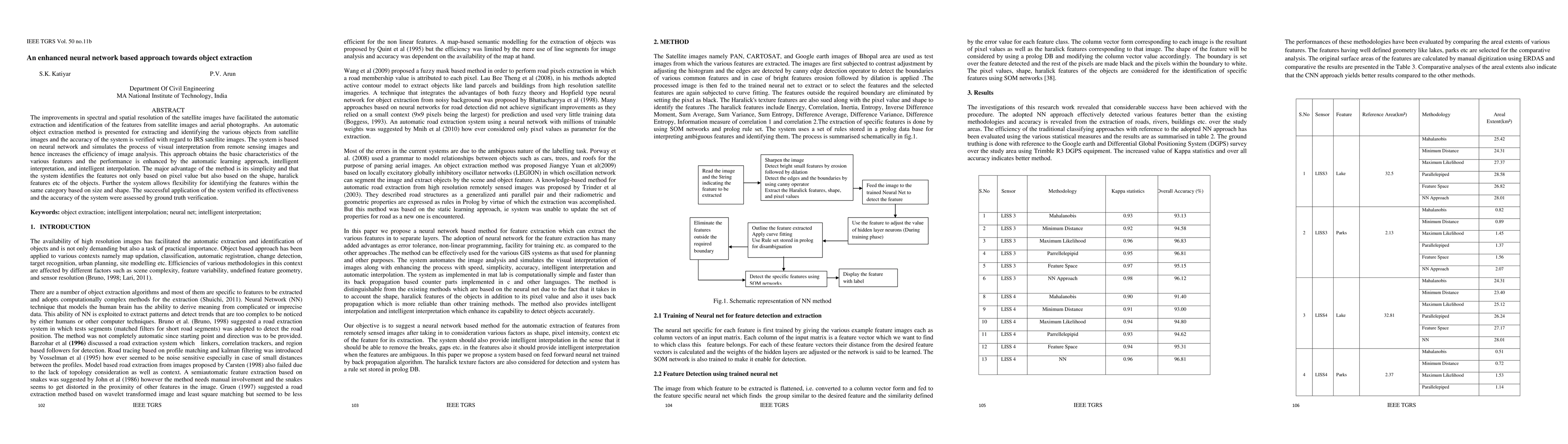 This paper presents an enhanced neural network method for automatic object extraction from satellite images, improving feature identification through spectral and spatial resolution advancements. The system's accuracy is validated using IRS satellite images, demonstrating its effectiveness and efficiency in image analysis.