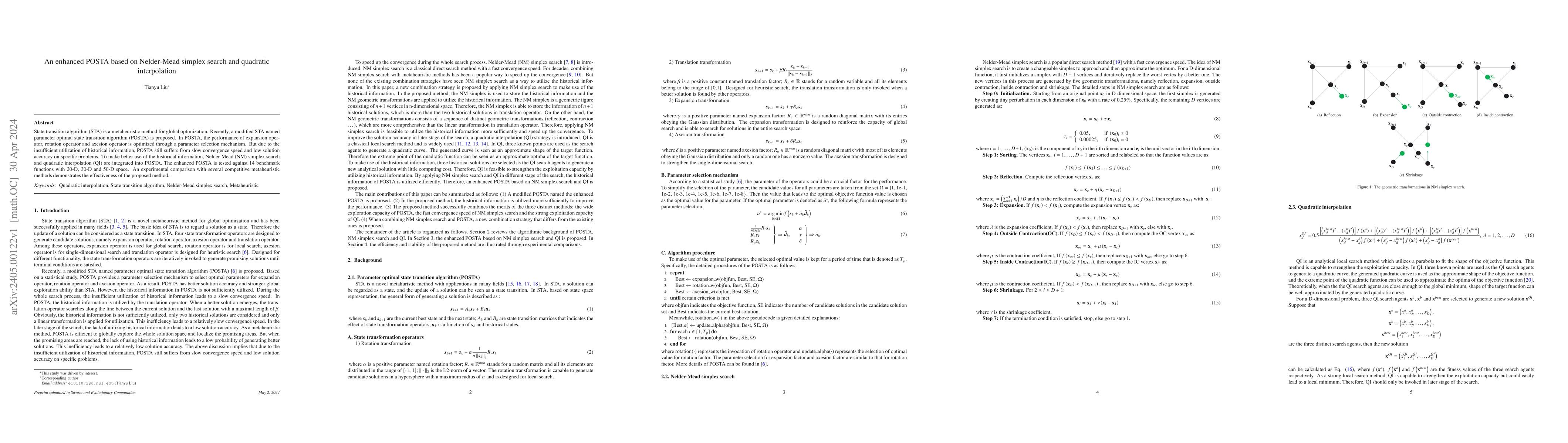 Title: An enhanced POSTA based on Nelder-Mead simplex search and quadratic interpolation Summary: This paper proposes an improved version of the parameter optimal state transition algorithm (POSTA) by integrating Nelder-Mead simplex search and quadratic interpolation to better utilize historical information, thereby accelerating convergence and improving solution accuracy. Experimental results show its superiority over several competitive metaheuristic methods on benchmark functions.