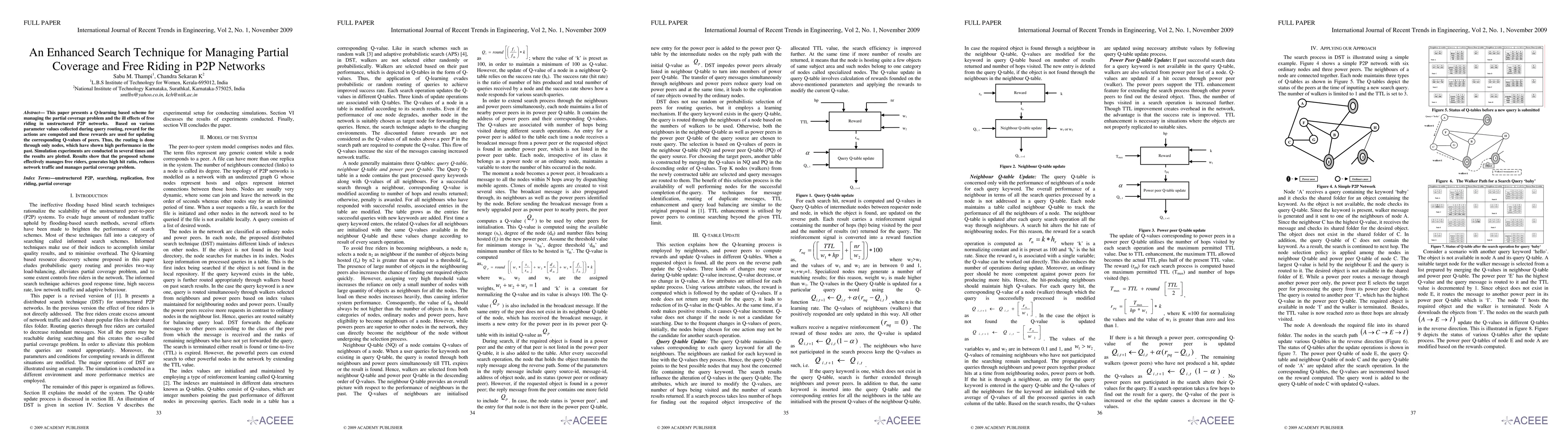This paper presents a Q-learning based scheme for managing the partial coverage problem and the ill-effects of free riding in unstructured P2P networks. Based on various parameter values collected during query routing, reward for the actions are computed and these rewards are used for updating the corresponding Q-values of peers. Thus, the routing is done through only nodes which have shown high performance in the past. Simulation experiments are conducted in several times and the results are plotted. Results show that the proposed scheme effectively manages free riders, generates high hit ratio, reduces network traffic and manages partial coverage problem.