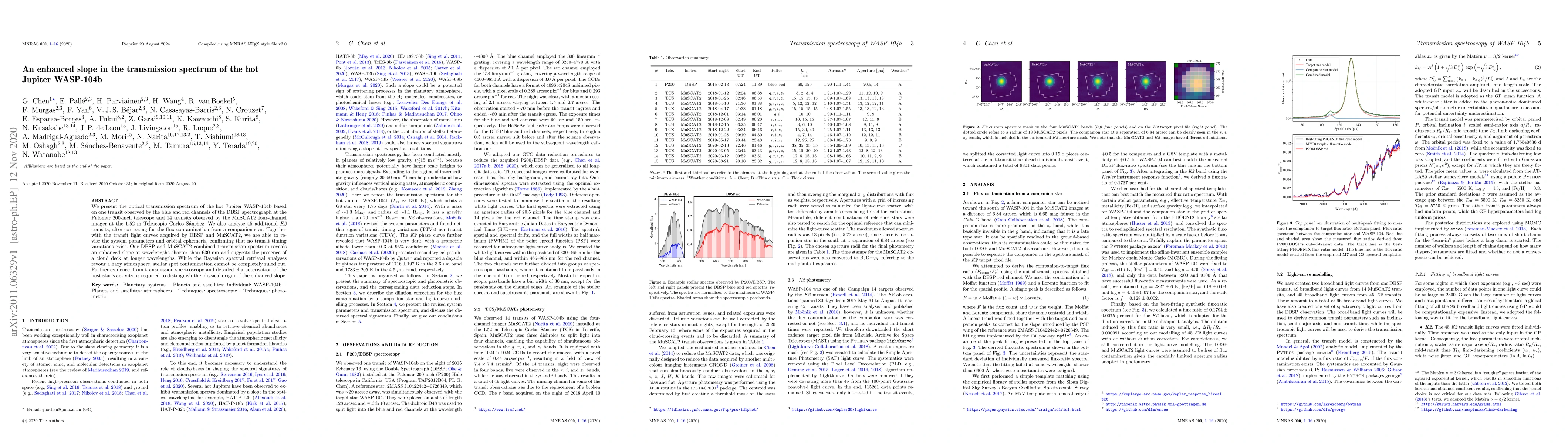 We present the optical transmission spectrum of the hot Jupiter WASP-104b based on one transit observed by the blue and red channels of the DBSP spectrograph at the Palomar 200-inch telescope and 14 transits observed by the MuSCAT2 four-channel imager at the 1.52 m Telescopio Carlos Sanchez. We also analyse 45 additional K2 transits, after correcting for the flux contamination from a companion star. Together with the transit light curves acquired by DBSP and MuSCAT2, we are able to revise the system parameters and orbital ephemeris, confirming that no transit timing variations exist. Our DBSP and MuSCAT2 combined transmission spectrum reveals an enhanced slope at wavelengths shorter than 630 nm and suggests the presence of a cloud deck at longer wavelengths. While the Bayesian spectral retrieval analyses favour a hazy atmosphere, stellar spot contamination cannot be completely ruled out. Further evidence, from transmission spectroscopy and detailed characterisation of the host star's activity, is required to distinguish the physical origin of the enhanced slope.