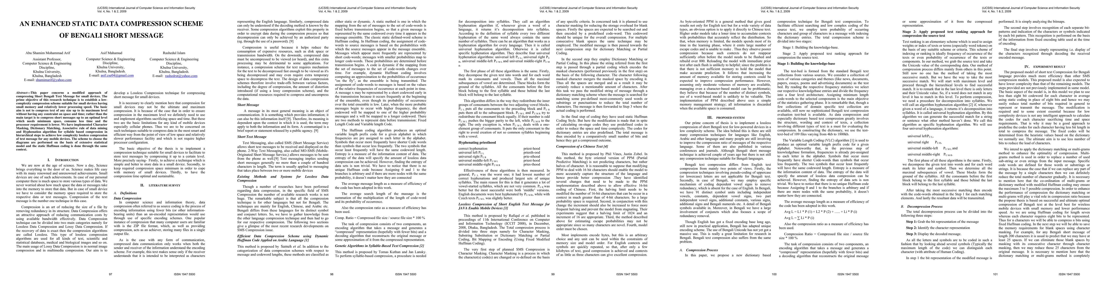 This paper proposes a low complexity static data compression scheme for short Bengali text messages, utilizing techniques like Character Masking, Dictionary Matching, and Hyphenation algorithm for optimal compression. The approach aims to achieve minimal space and time consumption suitable for small devices.