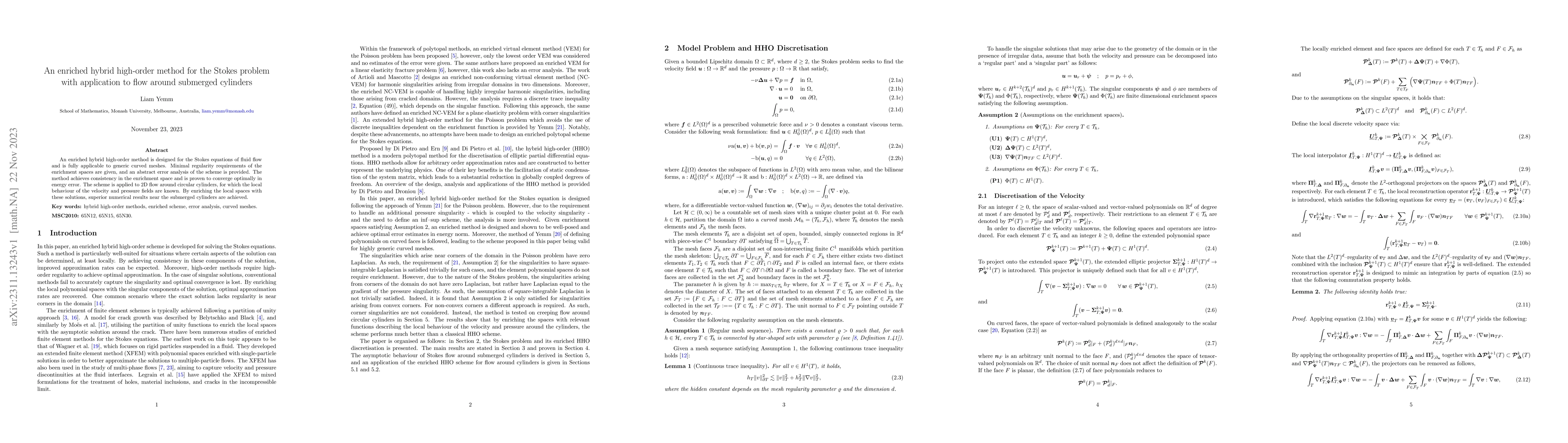 This paper introduces an enriched hybrid high-order method for solving the Stokes equations on curved meshes, demonstrating optimal convergence and achieving superior accuracy in simulating 2D flow around submerged cylinders by incorporating local solutions into the enrichment spaces.
