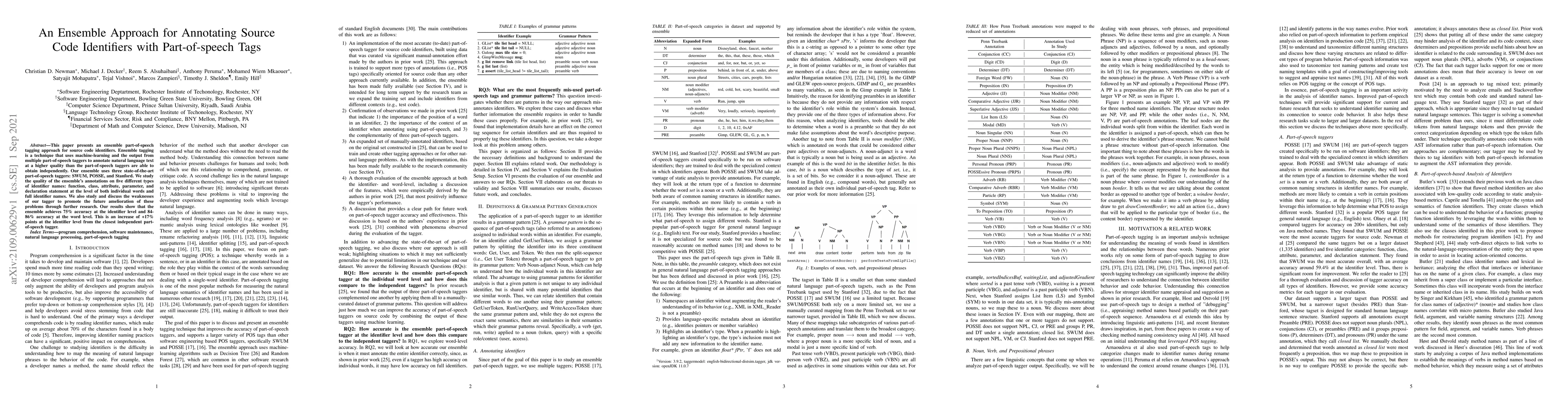This paper introduces an ensemble approach combining three part-of-speech taggers to annotate source code identifiers, achieving higher accuracy than individual taggers. The ensemble shows 75% accuracy for identifiers and 84-86% for individual words, a +17% improvement over the best single tagger.
