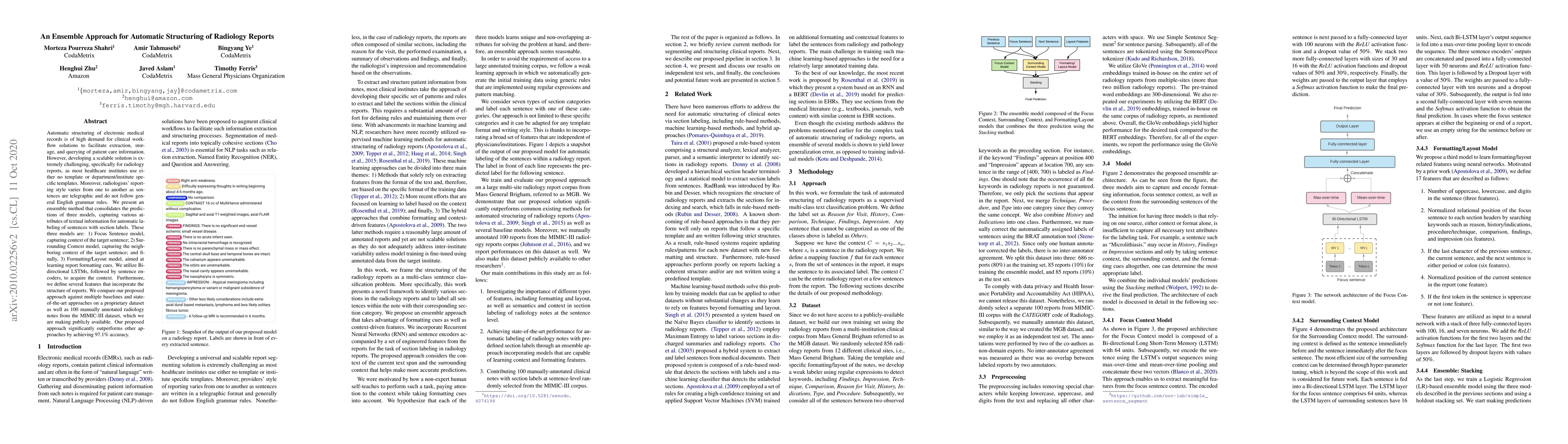 Automatic structuring of electronic medical records is of high demand for clinical workflow solutions to facilitate extraction, storage, and querying of patient care information. However, developing a scalable solution is extremely challenging, specifically for radiology reports, as most healthcare institutes use either no template or department/institute specific templates. Moreover, radiologists' reporting style varies from one to another as sentences are telegraphic and do not follow general English grammar rules. We present an ensemble method that consolidates the predictions of three models, capturing various attributes of textual information for automatic labeling of sentences with section labels. These three models are: 1) Focus Sentence model, capturing context of the target sentence; 2) Surrounding Context model, capturing the neighboring context of the target sentence; and finally, 3) Formatting/Layout model, aimed at learning report formatting cues. We utilize Bi-directional LSTMs, followed by sentence encoders, to acquire the context. Furthermore, we define several features that incorporate the structure of reports. We compare our proposed approach against multiple baselines and state-of-the-art approaches on a proprietary dataset as well as 100 manually annotated radiology notes from the MIMIC-III dataset, which we are making publicly available. Our proposed approach significantly outperforms other approaches by achieving 97.1% accuracy.