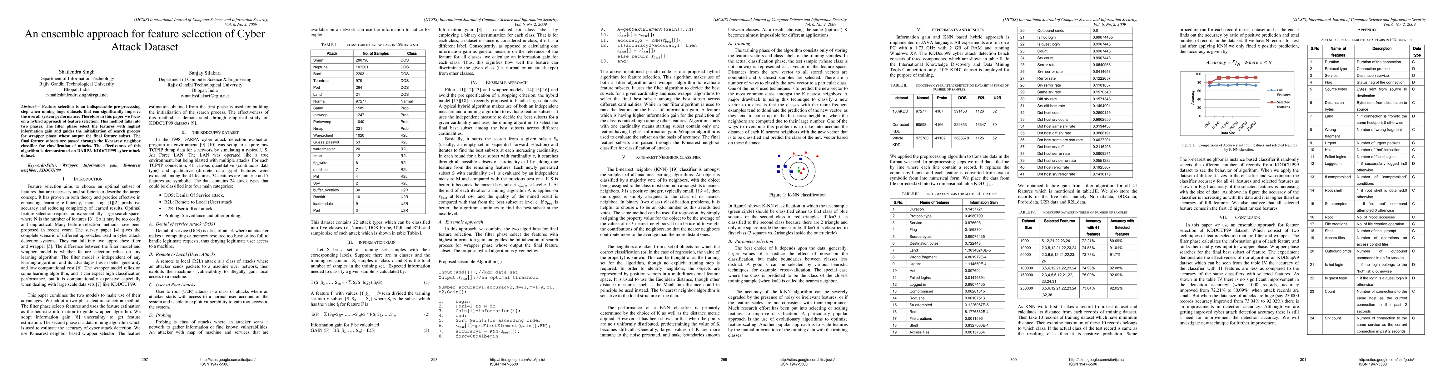 This paper proposes an ensemble feature selection method combining filter and wrapper phases to enhance system performance on large datasets, specifically applied to the DARPA KDDCUP99 cyber attack dataset, and evaluates its effectiveness using a K-nearest neighbor classifier.