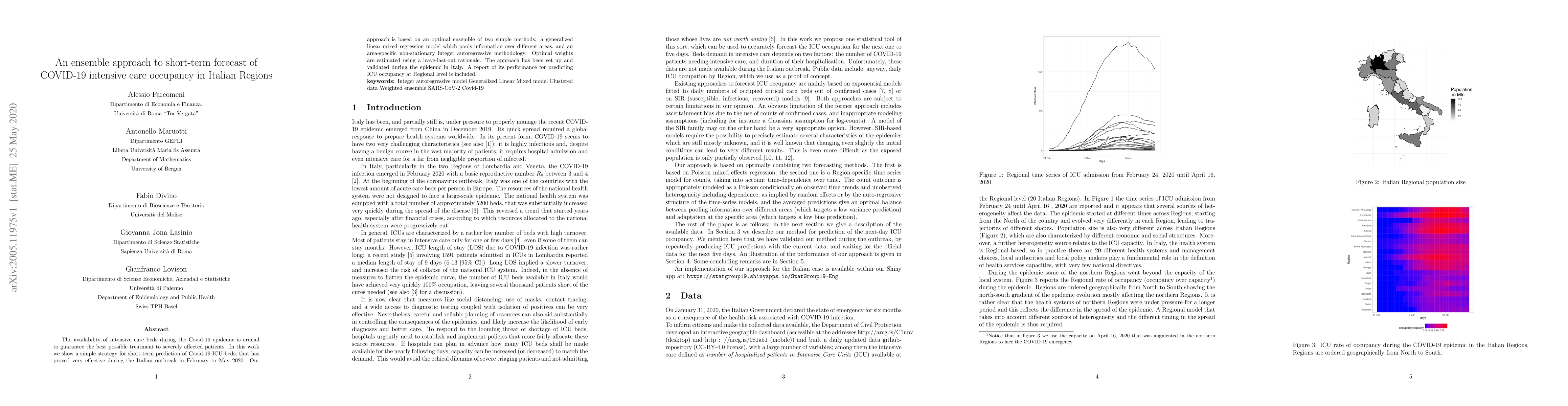This paper presents an ensemble forecasting method combining a generalized linear mixed regression model and a non-stationary integer autoregressive approach to predict COVID-19 ICU occupancy in Italian regions. The ensemble's optimal weights were determined using a leave-last-out strategy, demonstrating effective short-term forecasting during the Italian outbreak from February to May 2020.