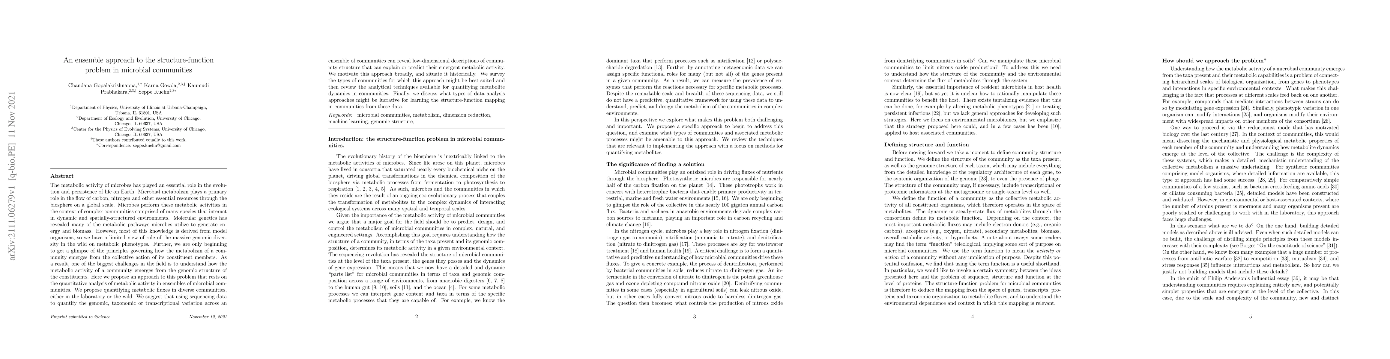 This paper proposes an ensemble approach to understand the relationship between microbial community structure and metabolic activity, suggesting that analyzing metabolic fluxes in diverse communities can reveal low-dimensional descriptions of community structure that predict their emergent metabolic functions. The paper reviews suitable community types and analytical techniques for quantifying metabolite dynamics.