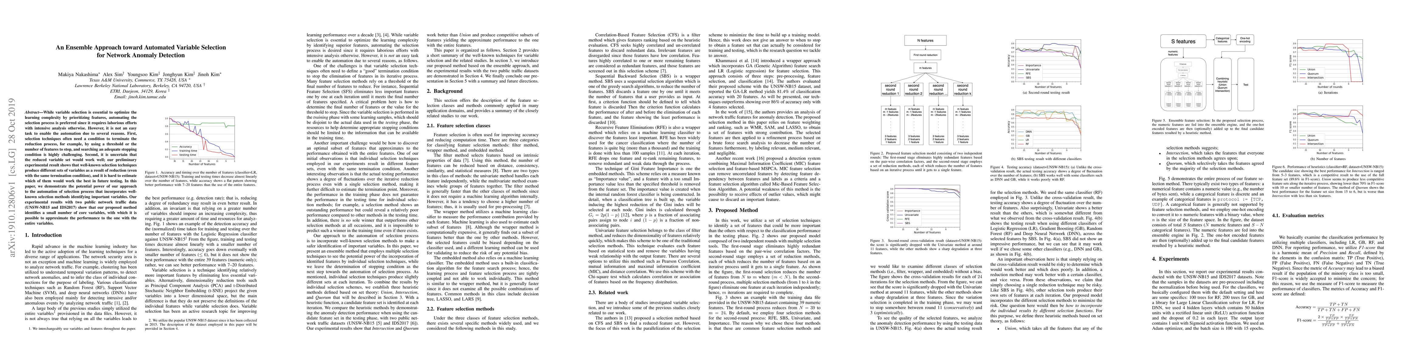 While variable selection is essential to optimize the learning complexity by prioritizing features, automating the selection process is preferred since it requires laborious efforts with intensive analysis otherwise. However, it is not an easy task to enable the automation due to several reasons. First, selection techniques often need a condition to terminate the reduction process, for example, by using a threshold or the number of features to stop, and searching an adequate stopping condition is highly challenging. Second, it is uncertain that the reduced variable set would work well; our preliminary experimental result shows that well-known selection techniques produce different sets of variables as a result of reduction (even with the same termination condition), and it is hard to estimate which of them would work the best in future testing. In this paper, we demonstrate the potential power of our approach to the automation of selection process that incorporates well-known selection methods identifying important variables. Our experimental results with two public network traffic data (UNSW-NB15 and IDS2017) show that our proposed method identifies a small number of core variables, with which it is possible to approximate the performance to the one with the entire variables.