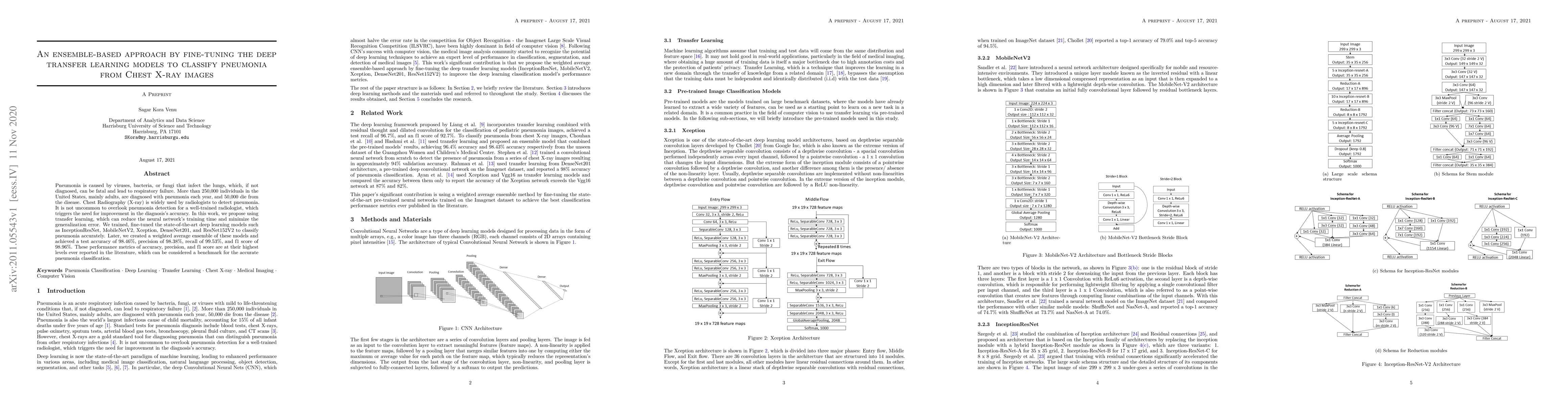 Pneumonia is caused by viruses, bacteria, or fungi that infect the lungs, which, if not diagnosed, can be fatal and lead to respiratory failure. More than 250,000 individuals in the United States, mainly adults, are diagnosed with pneumonia each year, and 50,000 die from the disease. Chest Radiography (X-ray) is widely used by radiologists to detect pneumonia. It is not uncommon to overlook pneumonia detection for a well-trained radiologist, which triggers the need for improvement in the diagnosis's accuracy. In this work, we propose using transfer learning, which can reduce the neural network's training time and minimize the generalization error. We trained, fine-tuned the state-of-the-art deep learning models such as InceptionResNet, MobileNetV2, Xception, DenseNet201, and ResNet152V2 to classify pneumonia accurately. Later, we created a weighted average ensemble of these models and achieved a test accuracy of 98.46%, precision of 98.38%, recall of 99.53%, and f1 score of 98.96%. These performance metrics of accuracy, precision, and f1 score are at their highest levels ever reported in the literature, which can be considered a benchmark for the accurate pneumonia classification.