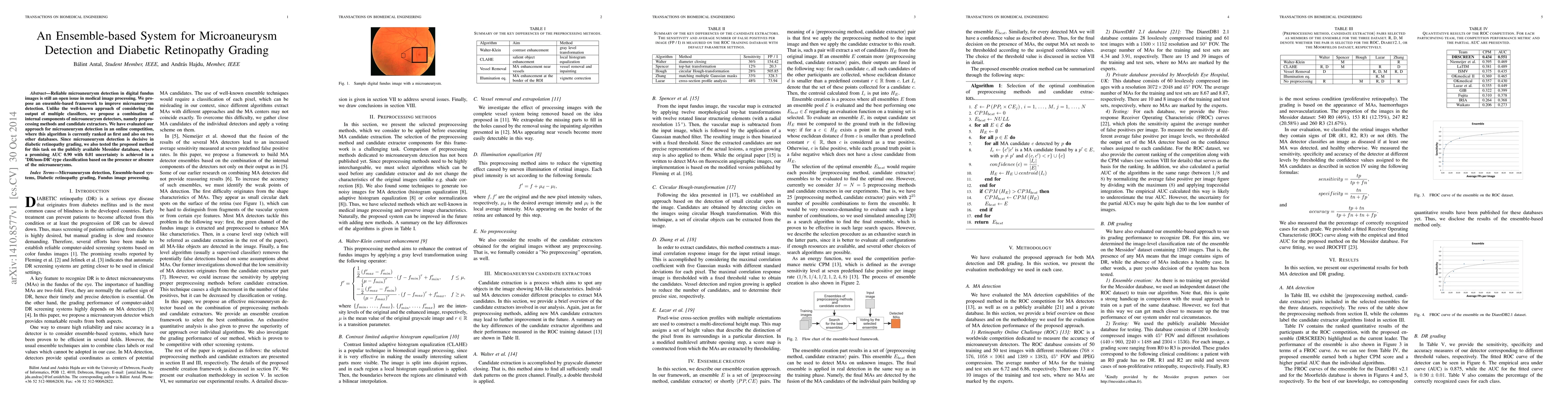 This paper proposes an ensemble-based framework for detecting microaneurysms in fundus images, combining preprocessing methods and candidate extractors rather than classifier outputs. The method ranks first in an online competition and achieves a promising AUC of 0.90 for diabetic retinopathy grading based on microaneurysm presence.