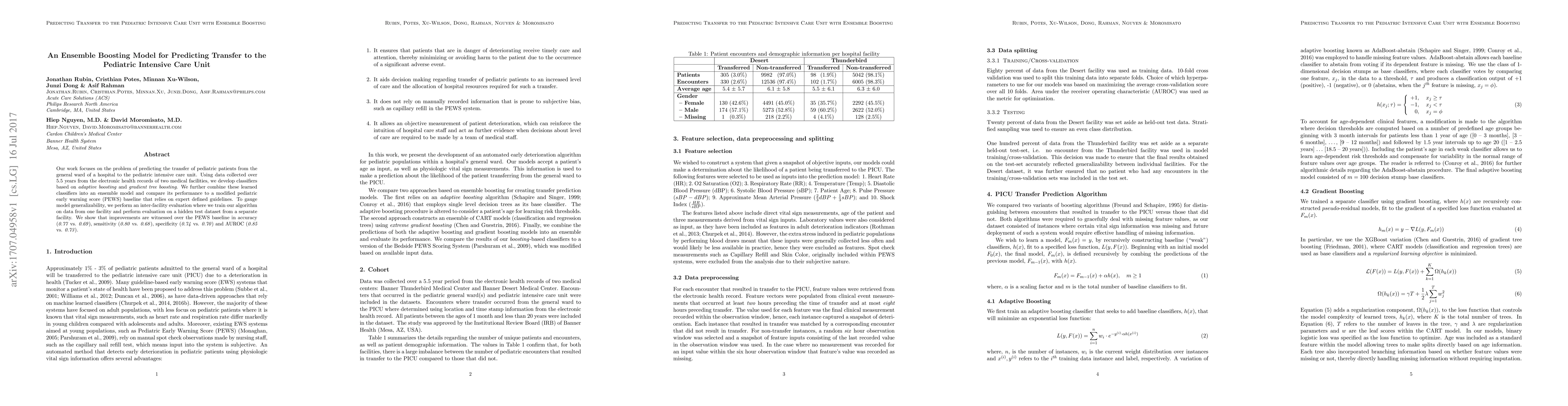 This study develops an ensemble boosting model to predict pediatric transfers to intensive care units, outperforming a traditional pediatric early warning score baseline in accuracy, sensitivity, specificity, and AUROC. The model's generalizability is validated through cross-facility evaluation.