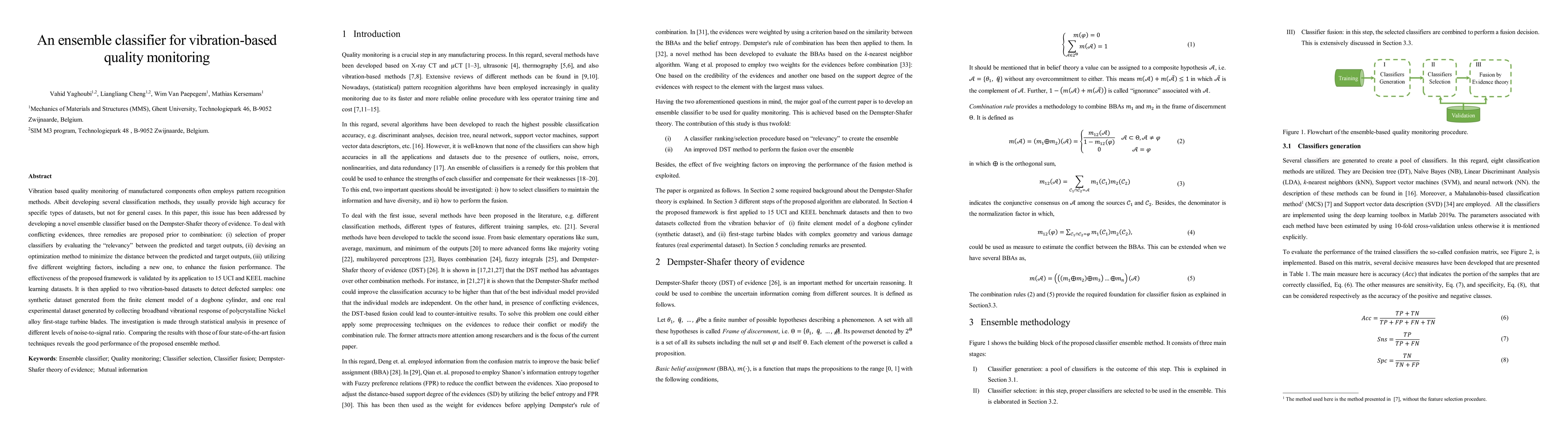 This paper proposes an ensemble classifier based on the Dempster-Shafer theory to improve vibration-based quality monitoring. The method includes classifier selection, optimization, and weighting factors to handle conflicting evidences, validated on various machine learning datasets and applied to detect defects in synthetic and real turbine blade vibration data.