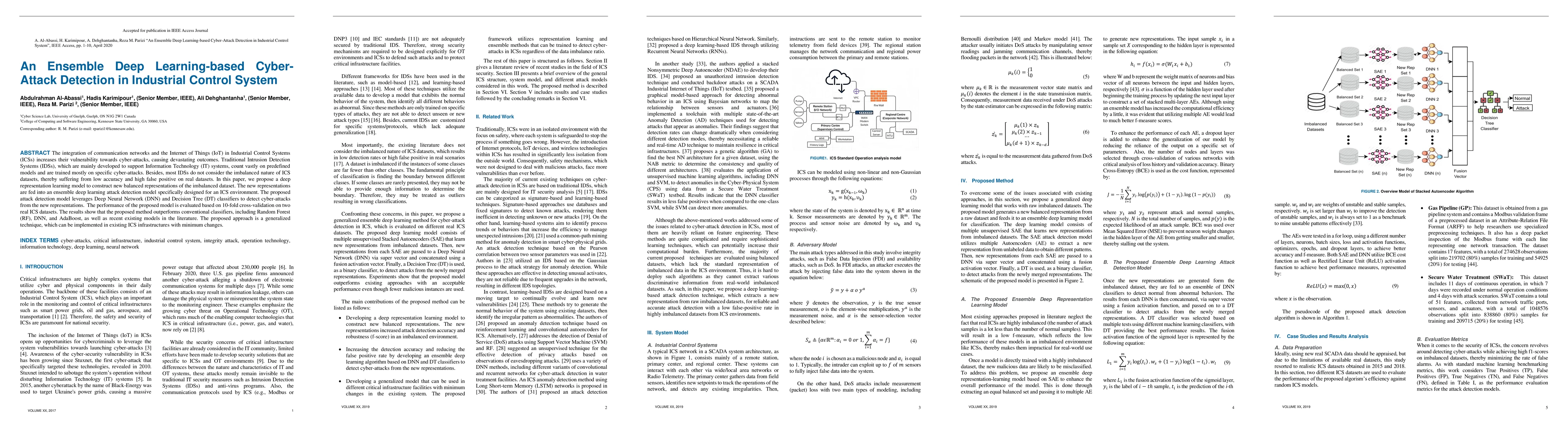 This paper proposes an ensemble deep learning model for detecting cyber-attacks in Industrial Control Systems (ICSs), addressing the imbalanced nature of ICS datasets. The model combines Deep Neural Network and Decision Tree classifiers to achieve superior performance over conventional and existing methods.