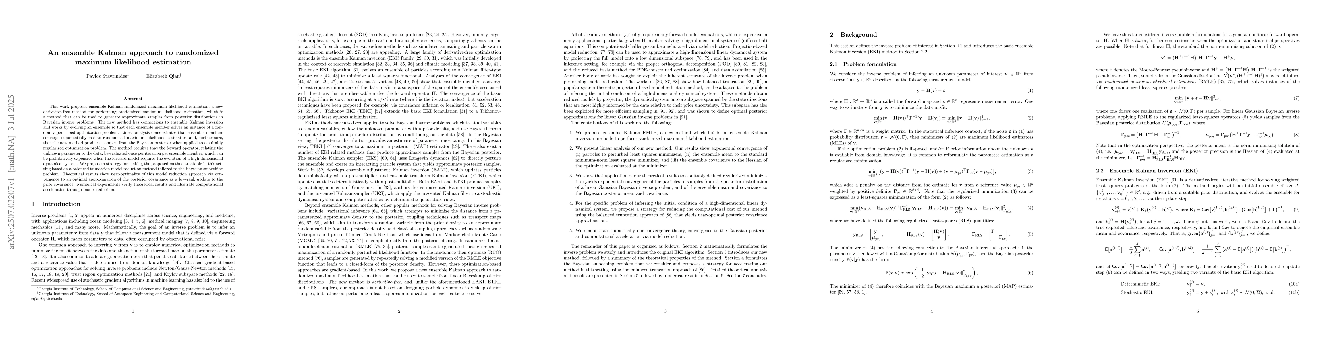 This work proposes ensemble Kalman randomized maximum likelihood estimation, a new derivative-free method for performing randomized maximum likelihood estimation, which is a method that can be used to generate approximate samples from posterior distributions in Bayesian inverse problems. The new method has connections to ensemble Kalman inversion and works by evolving an ensemble so that each ensemble member solves an instance of a randomly perturbed optimization problem. Linear analysis demonstrates that ensemble members converge exponentially fast to randomized maximum likelihood estimators and, furthermore, that the new method produces samples from the Bayesian posterior when applied to a suitably regularized optimization problem. The method requires that the forward operator, relating the unknown parameter to the data, be evaluated once per iteration per ensemble member, which can be prohibitively expensive when the forward model requires the evolution of a high-dimensional dynamical system. We propose a strategy for making the proposed method tractable in this setting based on a balanced truncation model reduction method tailored to the Bayesian smoothing problem. Theoretical results show near-optimality of this model reduction approach via convergence to an optimal approximation of the posterior covariance as a low-rank update to the prior covariance. Numerical experiments verify theoretical results and illustrate computational acceleration through model reduction.