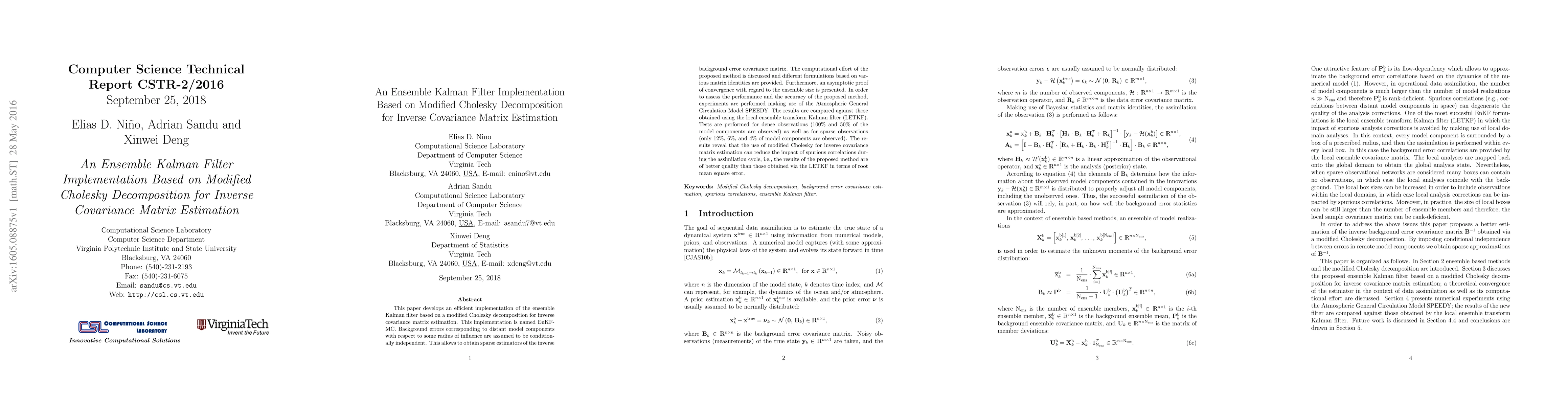 This paper introduces an efficient ensemble Kalman filter implementation, EnKF-MC, based on modified Cholesky decomposition for inverse covariance matrix estimation, which assumes conditional independence for distant model components. The method shows improved performance and reduced spurious correlations compared to the local ensemble transform Kalman filter (LETKF), as demonstrated through experiments using the SPEEDY model.