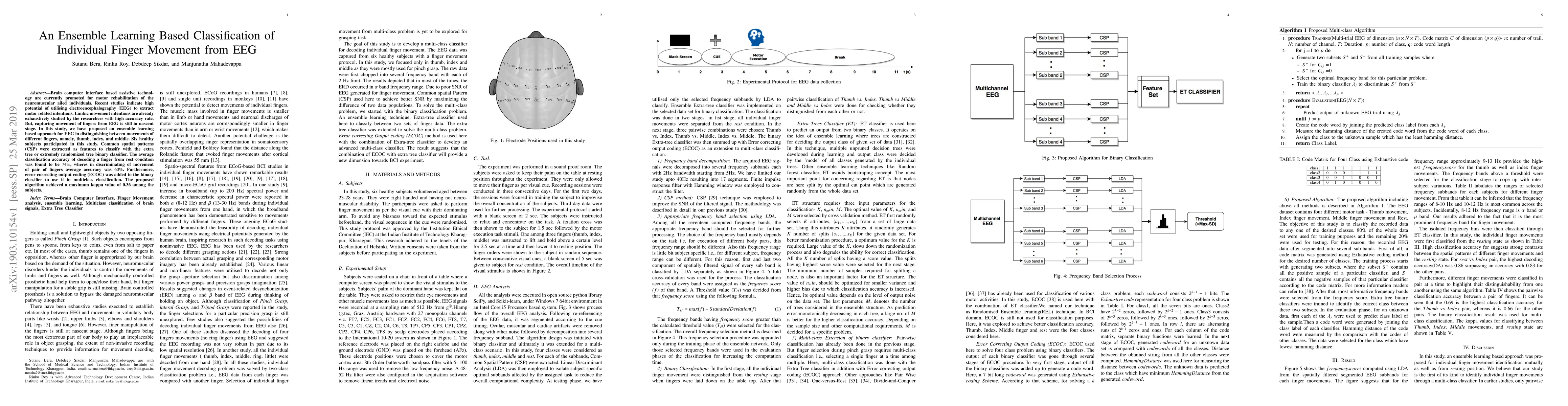 Brain computer interface based assistive technology are currently promoted for motor rehabilitation of the neuromuscular ailed individuals. Recent studies indicate a high potential of utilising electroencephalography (EEG) to extract motor related intentions. Limbic movement intentions are already exhaustively studied by the researchers with high accuracy rate. But, capturing movement of fingers from EEG is still in nascent stage. In this study, we have proposed an ensemble learning based approach for EEG in distinguishing between movements of different fingers, namely, thumb, index, and middle. Six healthy subjects participated in this study. Common spatial patterns (CSP) were extracted as features to classify with the extra tree or extremely randomized tree binary classifier. The average classification accuracy of decoding a finger from rest condition was found to be $74\%$, wheres in discriminating of movement of pair of fingers average accuracy was $60\%$. Furthermore, error correcting output coding (ECOC) was added to the binary classifier to use it in multiclass classification. The proposed algorithm achieved a maximum kappa value of 0.36 among the subjects.