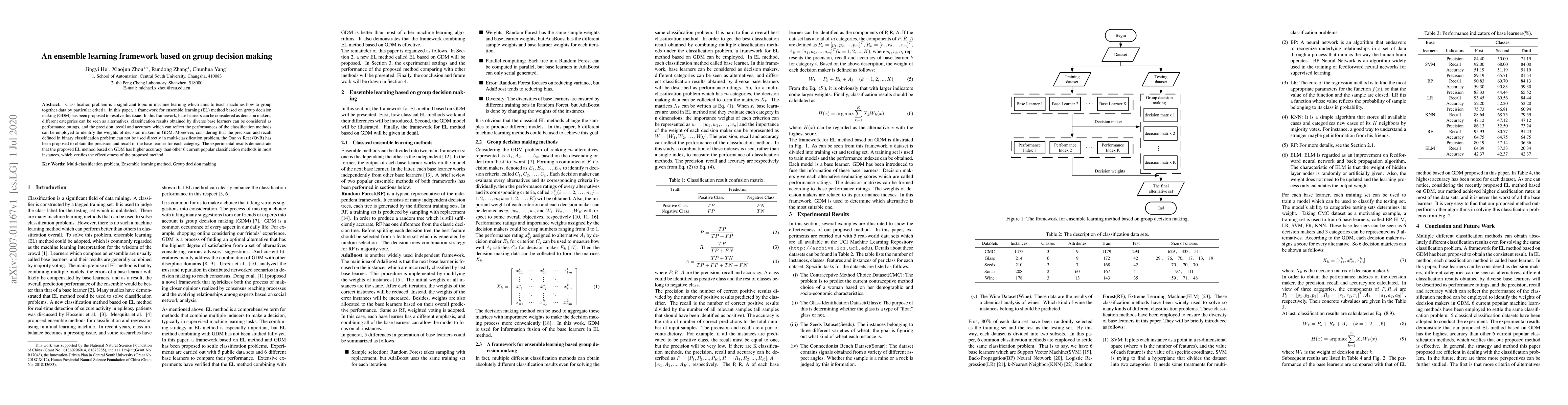 The classification problem is a significant topic in machine learning which aims to teach machines how to group together data by particular criteria. In this paper, a framework for the ensemble learning (EL) method based on group decision making (GDM) has been proposed to resolve this issue. In this framework, base learners can be considered as decision-makers, different categories can be seen as alternatives, classification results obtained by diverse base learners can be considered as performance ratings, and the precision, recall, and accuracy which can reflect the performances of the classification methods can be employed to identify the weights of decision-makers in GDM. Moreover, considering that the precision and recall defined in binary classification problems can not be used directly in the multi-classification problem, the One vs Rest (OvR) has been proposed to obtain the precision and recall of the base learner for each category. The experimental results demonstrate that the proposed EL method based on GDM has higher accuracy than other 6 current popular classification methods in most instances, which verifies the effectiveness of the proposed method.