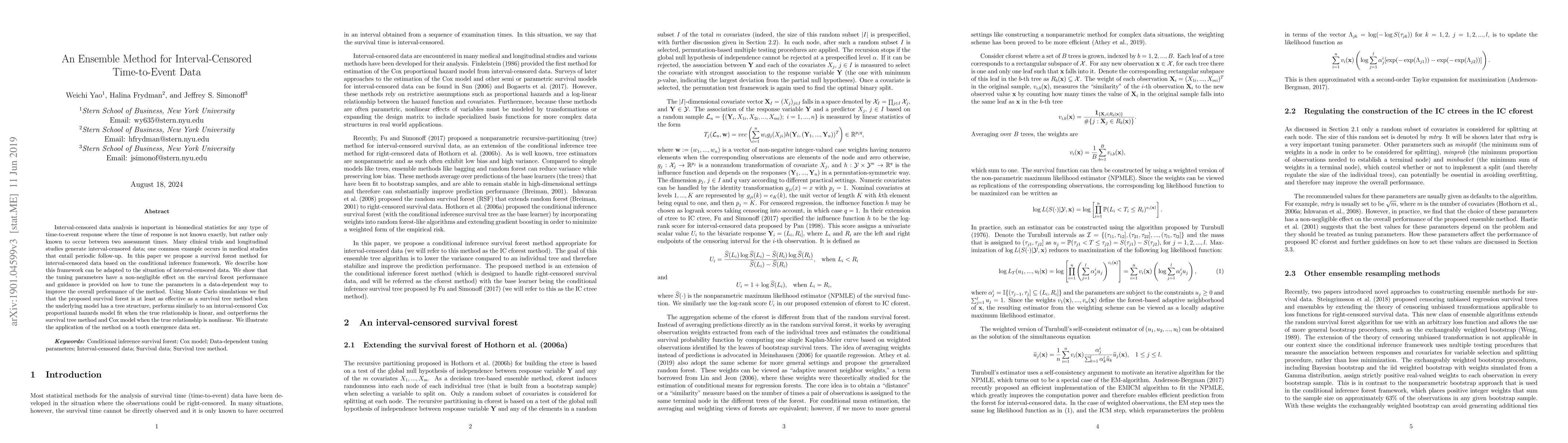 This paper proposes a survival forest method for analyzing interval-censored time-to-event data, demonstrating its effectiveness through Monte Carlo simulations and comparison with survival trees and Cox models. The method adapts the conditional inference framework and provides guidance on tuning parameters for optimal performance.