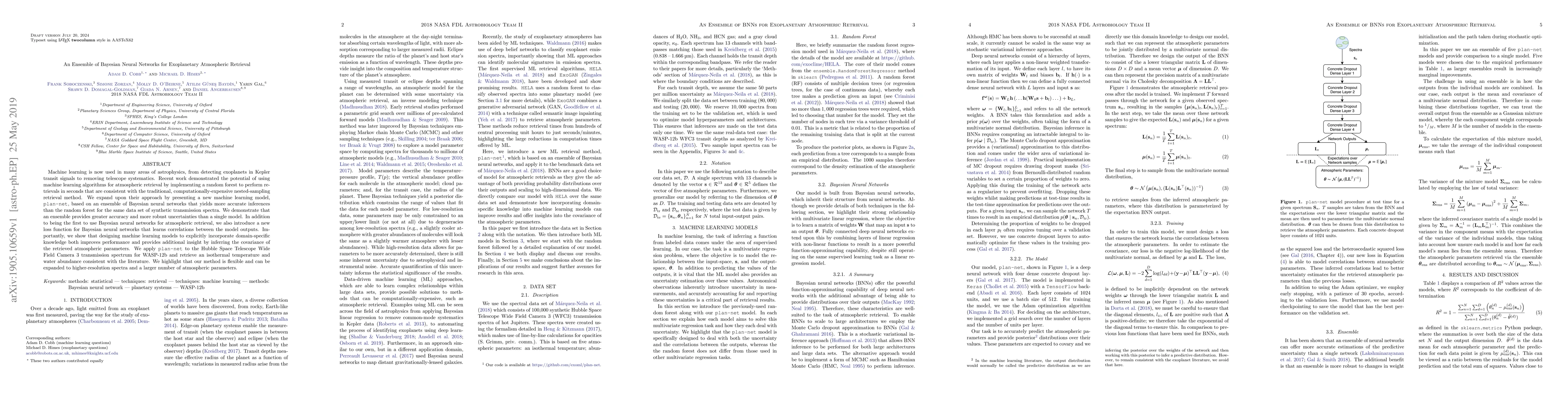 Machine learning is now used in many areas of astrophysics, from detecting exoplanets in Kepler transit signals to removing telescope systematics. Recent work demonstrated the potential of using machine learning algorithms for atmospheric retrieval by implementing a random forest to perform retrievals in seconds that are consistent with the traditional, computationally-expensive nested-sampling retrieval method. We expand upon their approach by presenting a new machine learning model, \texttt{plan-net}, based on an ensemble of Bayesian neural networks that yields more accurate inferences than the random forest for the same data set of synthetic transmission spectra. We demonstrate that an ensemble provides greater accuracy and more robust uncertainties than a single model. In addition to being the first to use Bayesian neural networks for atmospheric retrieval, we also introduce a new loss function for Bayesian neural networks that learns correlations between the model outputs. Importantly, we show that designing machine learning models to explicitly incorporate domain-specific knowledge both improves performance and provides additional insight by inferring the covariance of the retrieved atmospheric parameters. We apply \texttt{plan-net} to the Hubble Space Telescope Wide Field Camera 3 transmission spectrum for WASP-12b and retrieve an isothermal temperature and water abundance consistent with the literature. We highlight that our method is flexible and can be expanded to higher-resolution spectra and a larger number of atmospheric parameters.