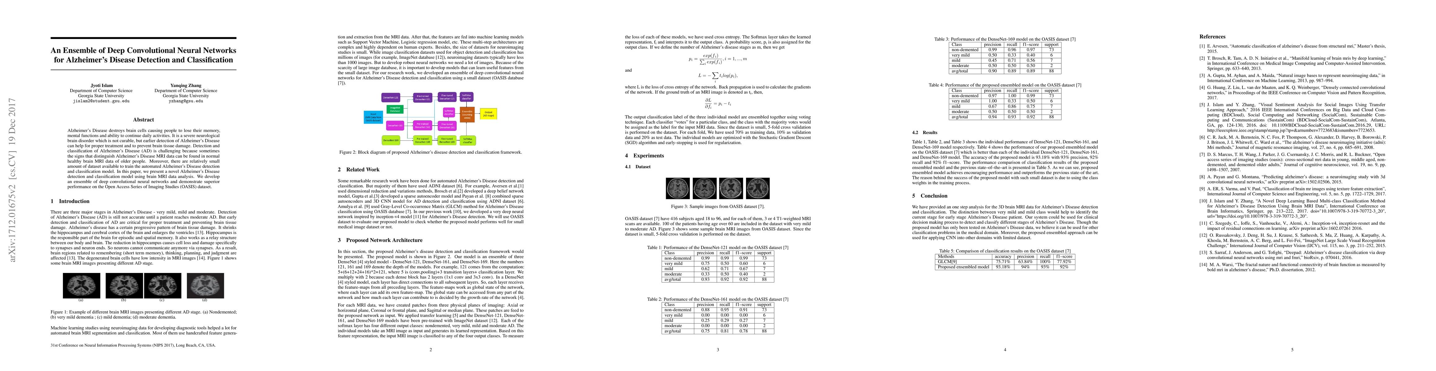 This paper proposes an ensemble of deep convolutional neural networks for detecting and classifying Alzheimer's Disease using brain MRI data. The model demonstrates superior performance on the OASIS dataset, highlighting its potential to aid in early detection and treatment.