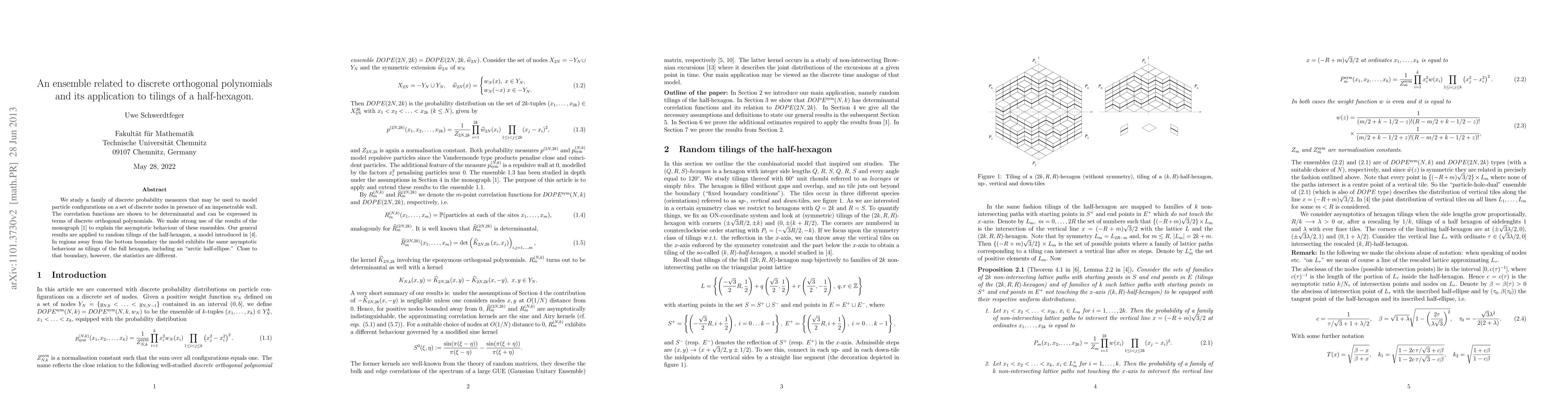 This paper explores the asymptotic properties of a family of discrete probability measures modeled by discrete orthogonal polynomials, revealing determinantal correlations. It applies this framework to study random tilings of a half-hexagon, equivalent to configurations of non-intersecting lattice paths above a wall.