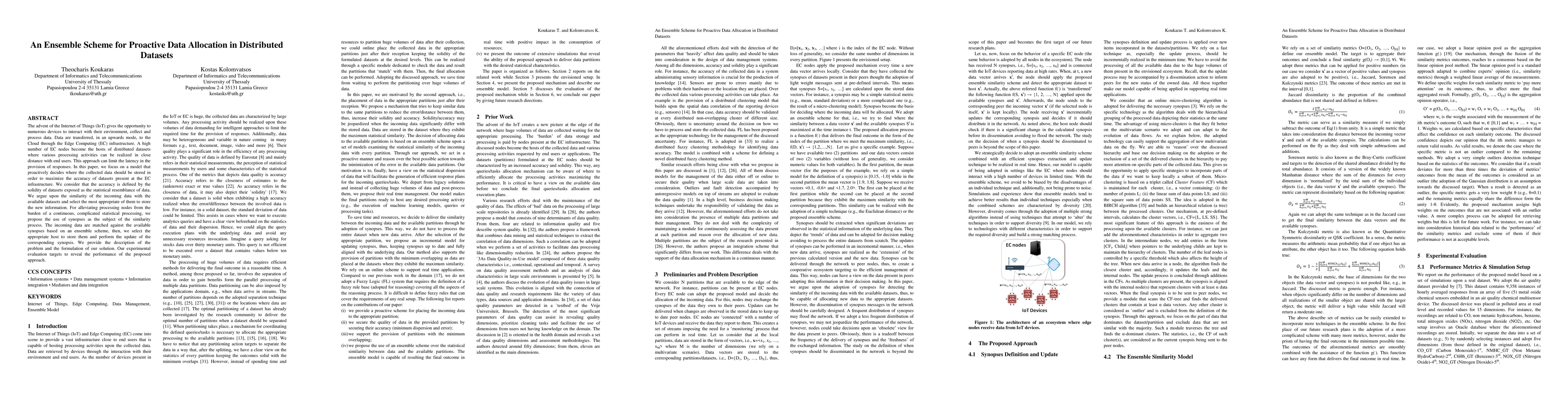 This paper proposes an ensemble scheme for proactive data allocation in distributed datasets within Edge Computing infrastructures, aiming to maximize dataset accuracy by matching incoming data with existing synopses and selecting the most appropriate host for storage. Experimental results evaluate the performance of this approach in reducing latency and processing burden.