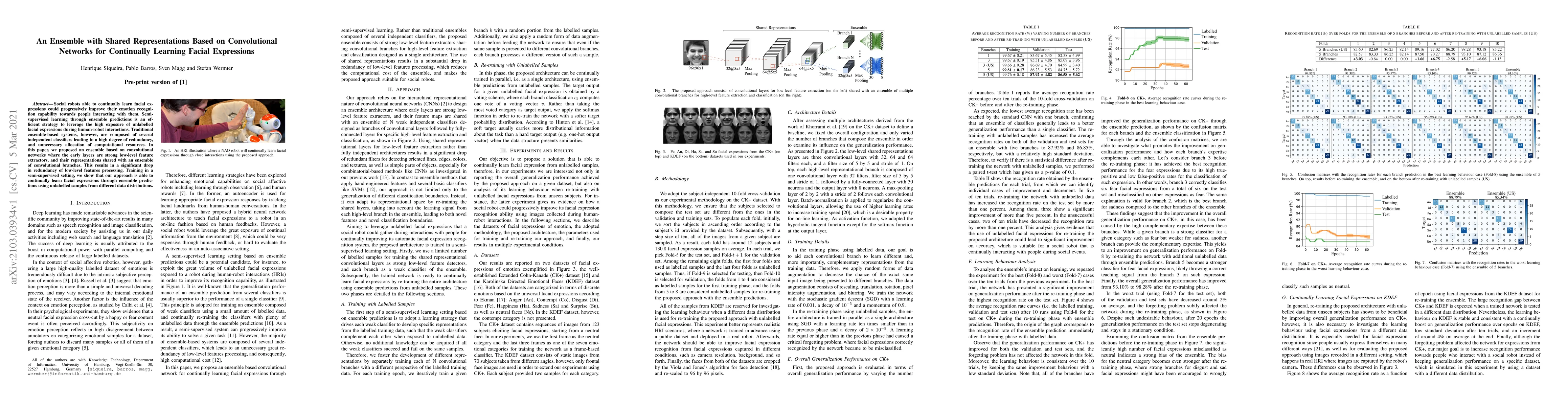 This paper proposes an ensemble of convolutional networks for continually learning facial expressions, where shared low-level feature representations reduce redundancy. The approach leverages semi-supervised learning to improve emotion recognition in social robots through efficient use of computational resources.