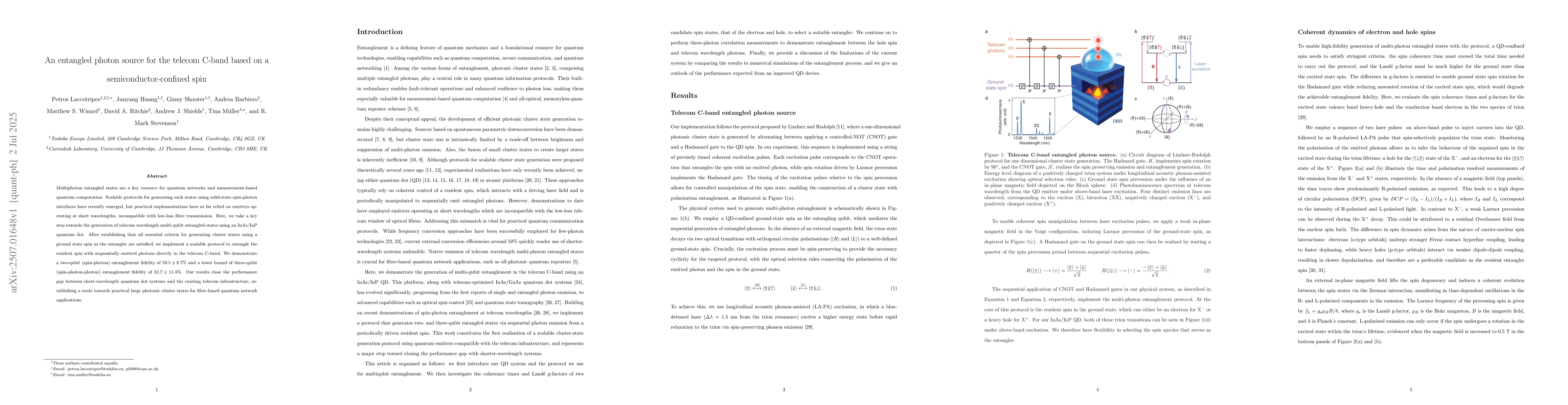 Multiphoton entangled states are a key resource for quantum networks and measurement-based quantum computation. Scalable protocols for generating such states using solid-state spin-photon interfaces have recently emerged, but practical implementations have so far relied on emitters operating at short wavelengths, incompatible with low-loss fibre transmission. Here, we take a key step towards the generation of telecom wavelength multi-qubit entangled states using an InAs/InP quantum dot. After establishing that all essential criteria for generating cluster states using a ground state spin as the entangler are satisfied, we implement a scalable protocol to entangle the resident spin with sequentially emitted photons directly in the telecom C-band. We demonstrate a two-qubit (spin-photon) entanglement fidelity of $59.5\pm 8.7\%$ and a lower bound of three-qubit (spin-photon-photon) entanglement fidelity of $52.7\pm 11.4\%$. Our results close the performance gap between short-wavelength quantum dot systems and the existing telecom infrastructure, establishing a route towards practical large photonic cluster states for fibre-based quantum network applications.