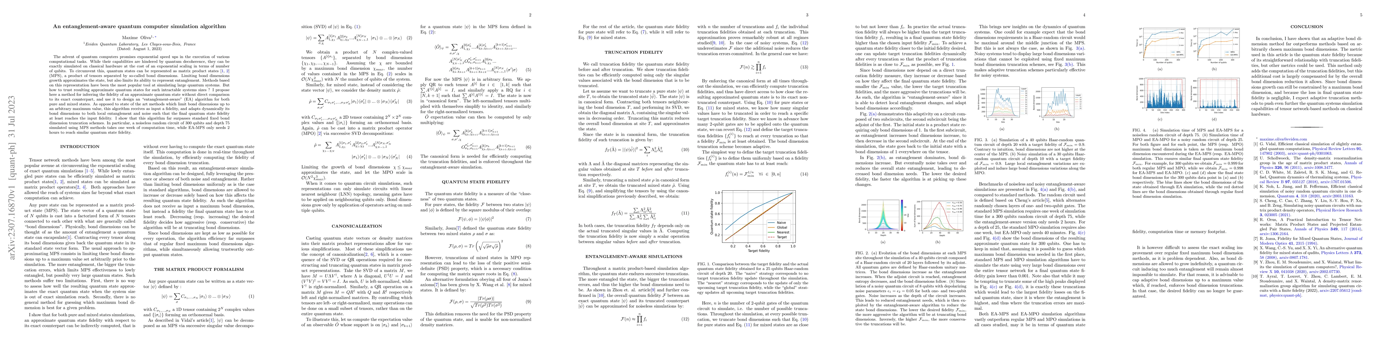 This paper proposes an "entanglement-aware" (EA) algorithm for simulating quantum computers using matrix product states (MPS), which dynamically adjusts bond dimensions to achieve a desired fidelity level, significantly outperforming standard fixed bond dimension methods. The EA-MPS algorithm reduces simulation time for large quantum circuits, such as a 300-qubit, 75-depth random circuit, from one week to just two hours.