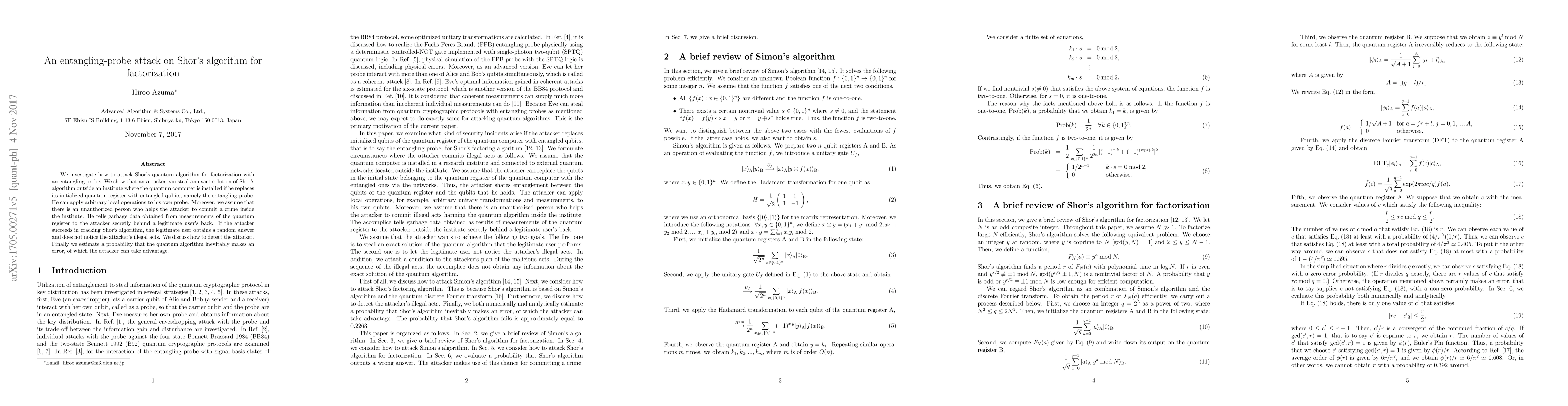 This paper explores a novel attack on Shor's quantum factorization algorithm using an entangling probe, demonstrating how an attacker can steal the exact solution by replacing the quantum register with entangled qubits and collaborating with an insider. The study also discusses detection methods and estimates the probability of the algorithm's error exploitation.