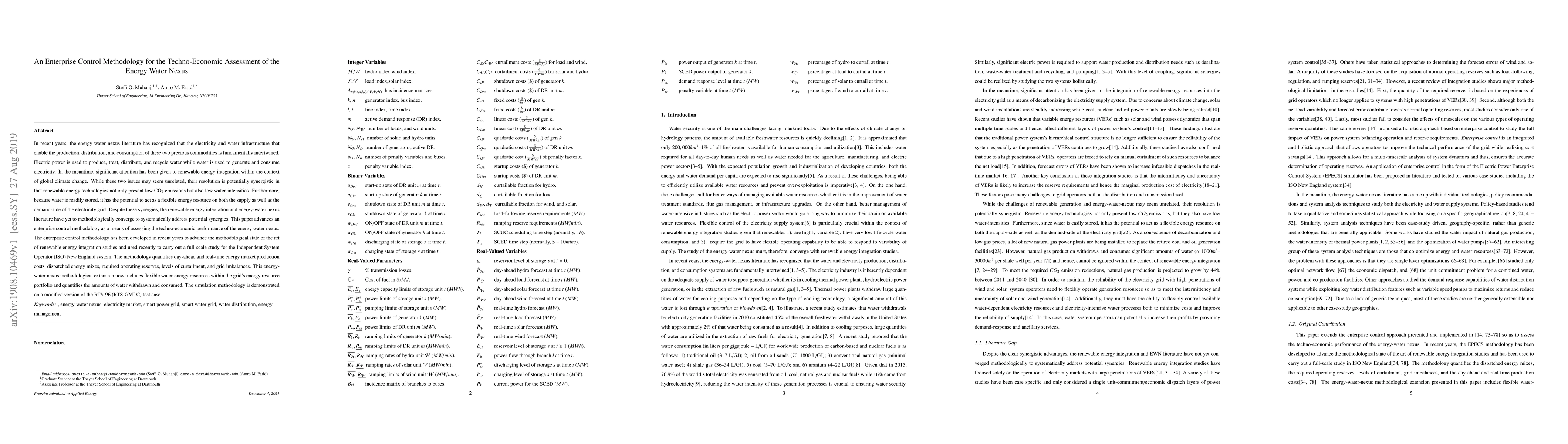 This paper proposes an enterprise control methodology to assess the techno-economic performance of the energy-water nexus, integrating renewable energy technologies and quantifying water-energy interactions. The methodology evaluates production costs, energy mixes, and water usage, demonstrated through a modified RTS-96 test case.