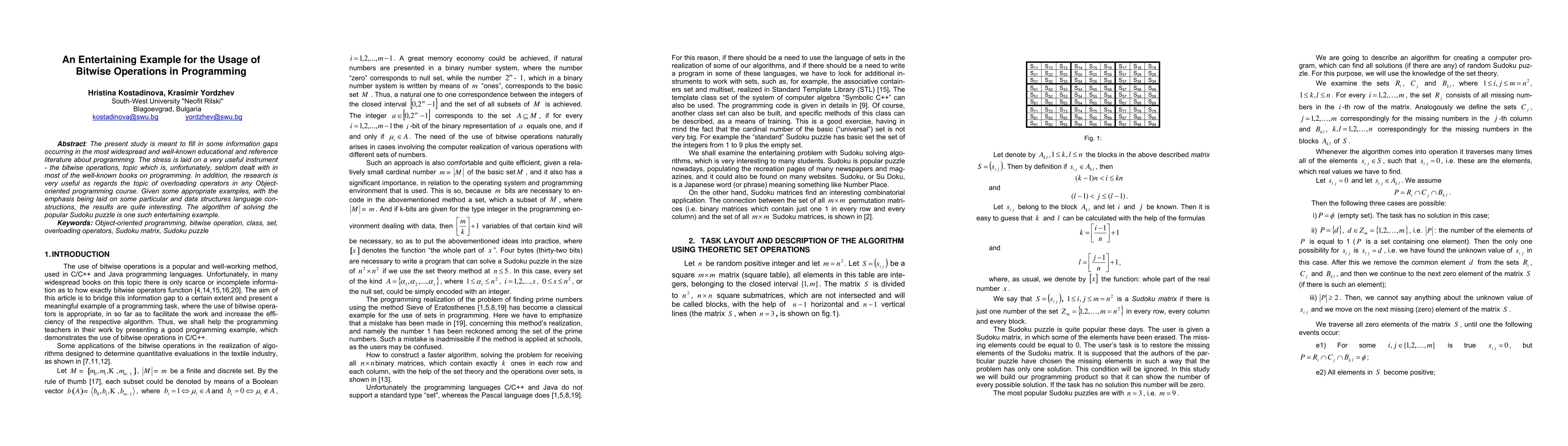 The present study is meant to fill in some information gaps occurring in the most widespread and well-known educational and reference literature about programming. The stress is laid on a very useful instrument - the bitwise operations, topic which is, unfortunately, seldom dealt with in most of the well-known books on programming. In addition, the research is very useful as regards the topic of overloading operators in any Object-oriented programming course. Given some appropriate examples, with the emphasis being laid on some particular and data structures language constructions, the results are quite interesting. The algorithm of solving the popular Sudoku puzzle is one such entertaining example.