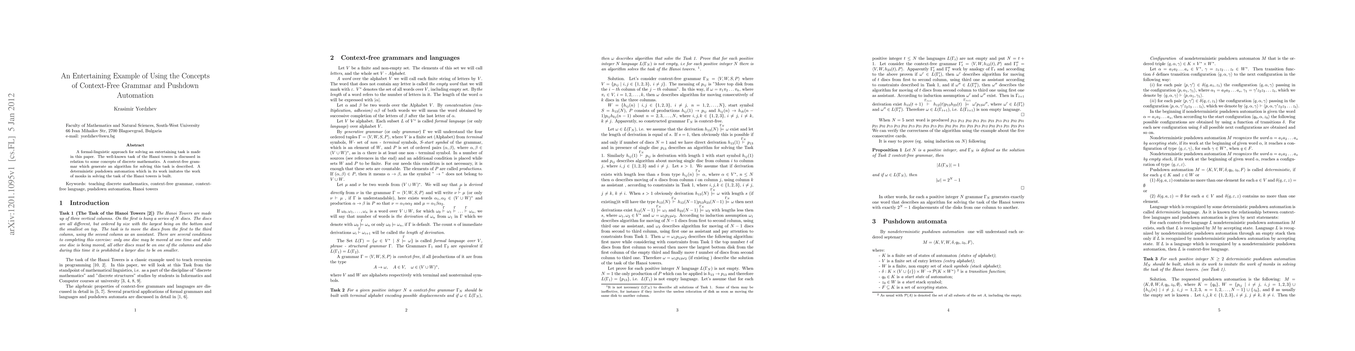 A formal-linguistic approach for solving an entertaining task is made in this paper. The well-known task of the Hanoi towers is discussed in relation to some concepts of discrete mathematics. A context-free grammar which generate an algorithm for solving this task is described. A deterministic pushdown automation which in its work imitates the work of monks in solving the task of the Hanoi towers is built.