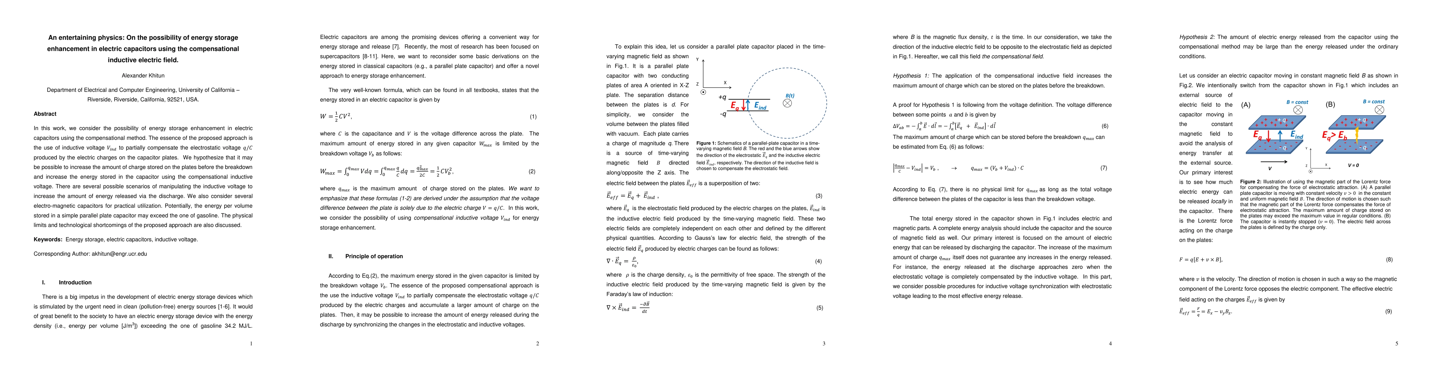 This paper explores enhancing energy storage in electric capacitors by using an inductive electric field to compensate the electrostatic voltage, potentially increasing charge storage and energy density. The study discusses various methods to manipulate the inductive voltage and examines practical electro-magnetic capacitors, while also discussing physical limits and technological challenges.