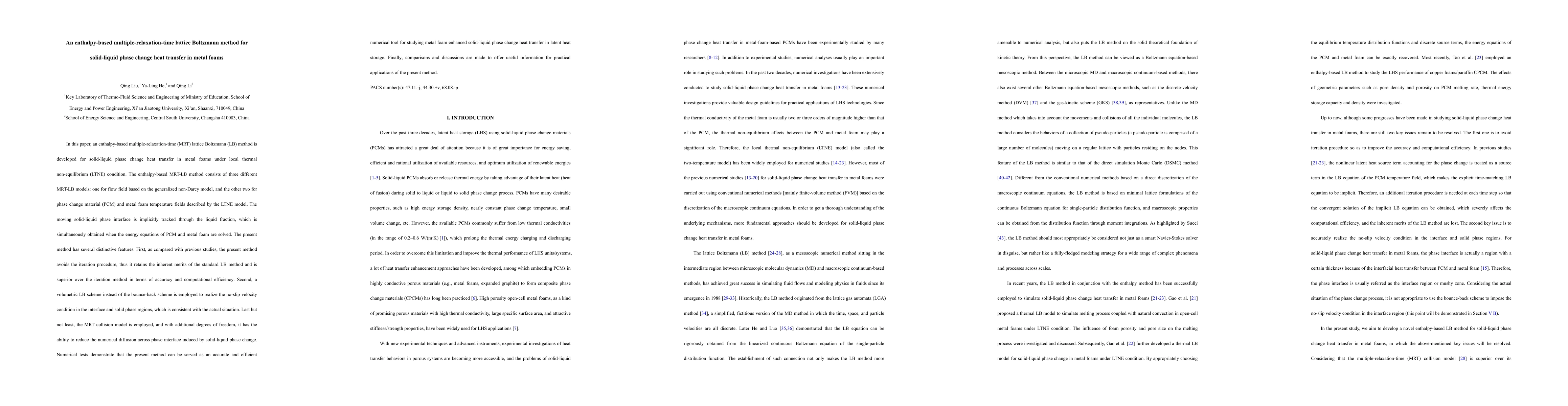 This paper develops an enthalpy-based multiple-relaxation-time (MRT) lattice Boltzmann method for simulating solid-liquid phase change heat transfer in metal foams under local thermal non-equilibrium conditions. The method avoids iterative procedures, employs a volumetric scheme for no-slip conditions, and reduces numerical diffusion, demonstrating accuracy and efficiency in numerical simulations.
