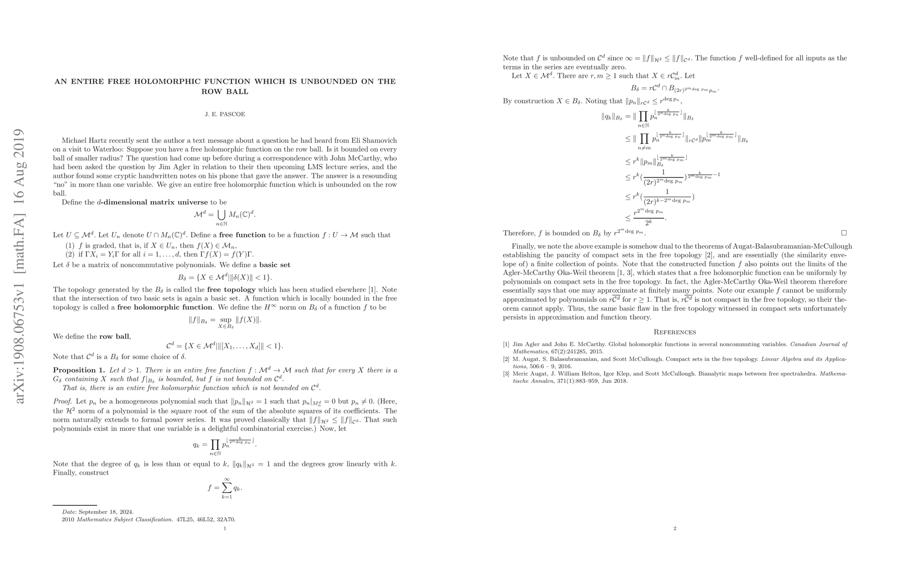 We give an entire free holomorphic function $f$ which is unbounded on the row ball. That is, we give a holomorphic free noncommutative function which is continuous in the free topology developed by Agler and McCarthy but is unbounded on the set of row contractions.