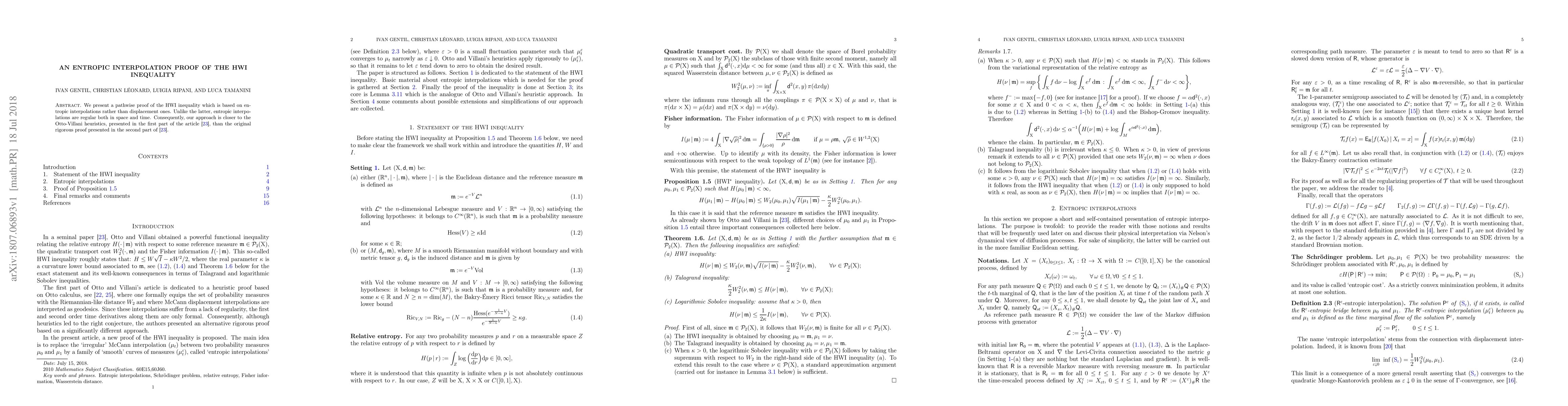 The paper provides a pathwise proof of the HWI inequality using entropic interpolations instead of displacement interpolations, aligning more closely with Otto-Villani heuristics than the original rigorous proof. Entropic interpolations offer regularity in both space and time.