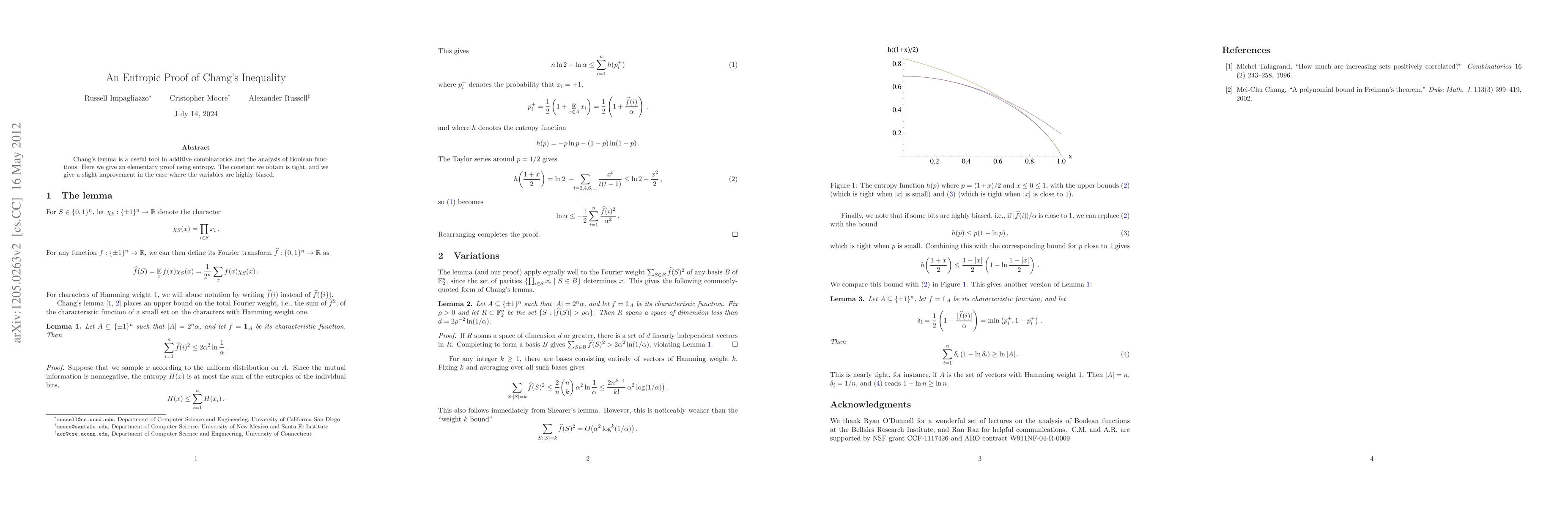 This paper presents an entropic proof of Chang's inequality, providing an elementary approach using entropy that yields a tight constant. It also offers a slight enhancement when the variables involved are highly biased.