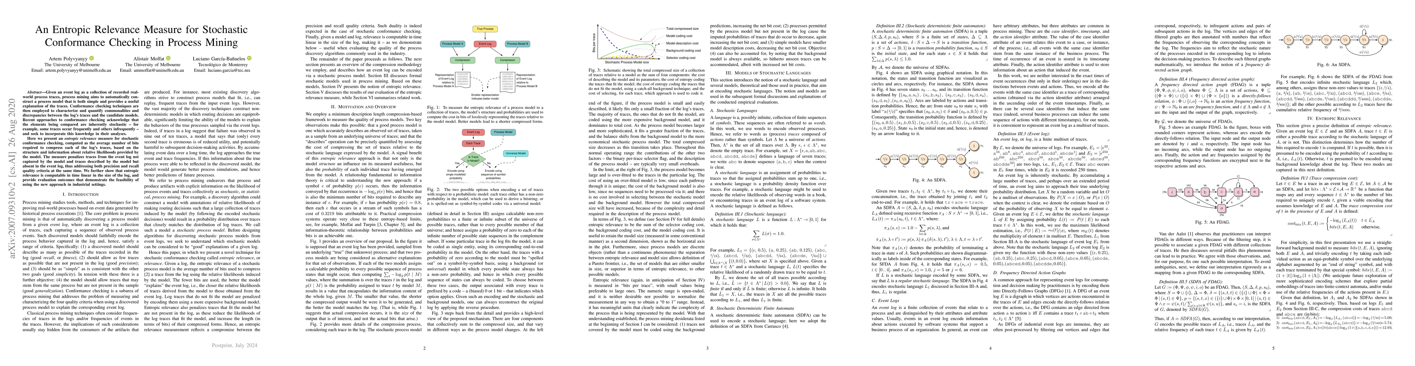 Researchers developed an entropic relevance measure for process mining to quantify similarities between event logs and candidate models, improving conformance checking accuracy. The new method uses compression to penalize missing and irrelevant traces, demonstrating its feasibility in industrial settings.