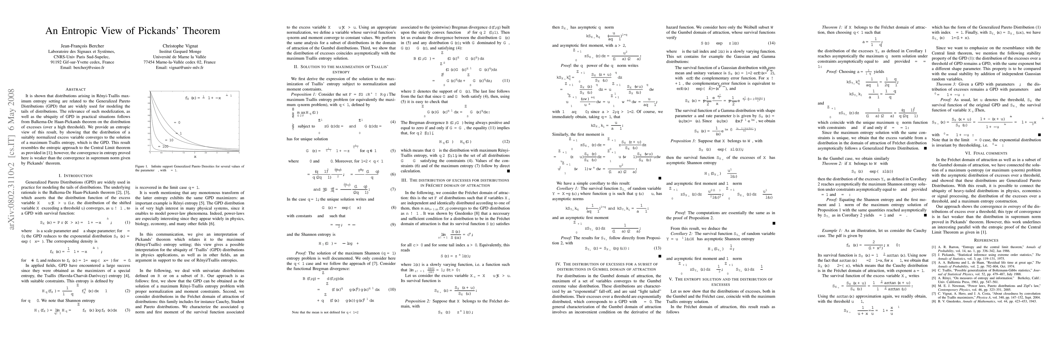 It is shown that distributions arising in Renyi-Tsallis maximum entropy setting are related to the Generalized Pareto Distributions (GPD) that are widely used for modeling the tails of distributions. The relevance of such modelization, as well as the ubiquity of GPD in practical situations follows from Balkema-De Haan-Pickands theorem on the distribution of excesses (over a high threshold). We provide an entropic view of this result, by showing that the distribution of a suitably normalized excess variable converges to the solution of a maximum Tsallis entropy, which is the GPD. This highlights the relevance of the so-called Tsallis distributions in many applications as well as some relevance to the use of the corresponding entropy.