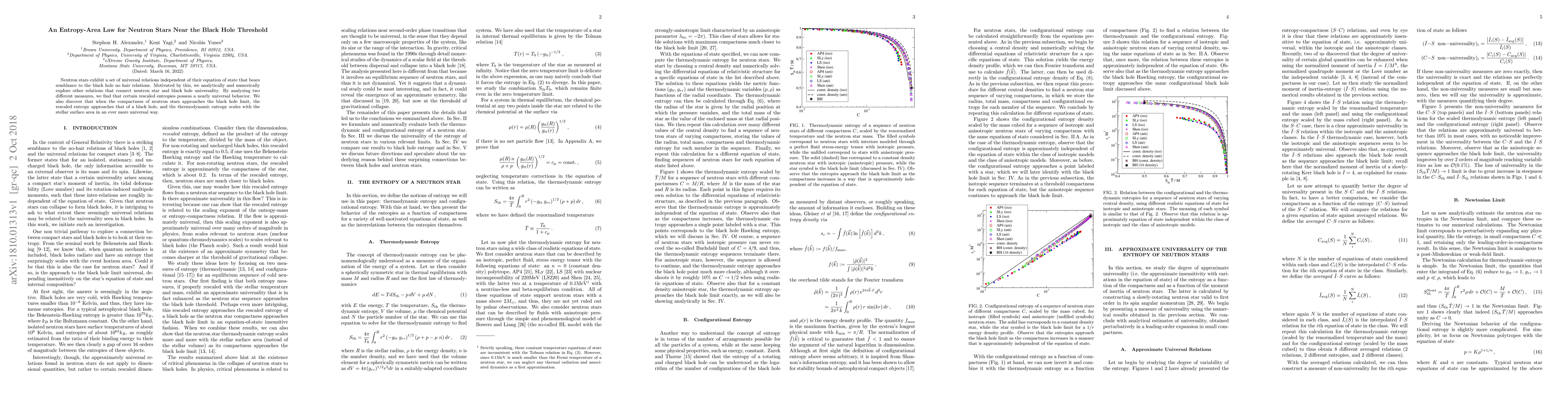 This paper investigates universal relations between neutron stars and black holes, finding that rescaled entropies of neutron stars near the black hole threshold exhibit nearly universal behavior. It concludes that as neutron star compactness approaches the black hole limit, the thermodynamic entropy scales with the stellar surface area similarly to black holes.